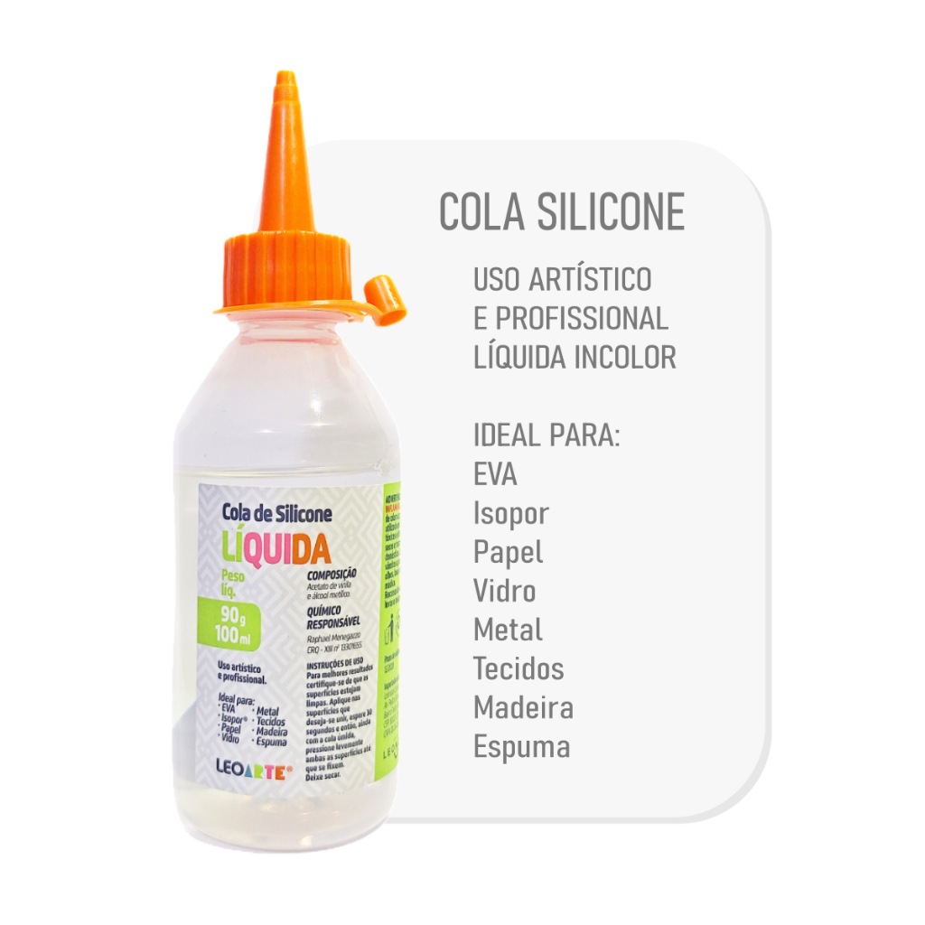 Cola de silicone líquida 100ml Leoarte, uso artístico e profissional A Cola de silicone liquida Leo Arte é ideal para: madeira, papelão, papel, plástico, eva, isopor, espuma, vidro, metal, tecidos, com 100ml. Conteúdo do anúncio: 3 unidades de cola de silicone com 100ml cada.