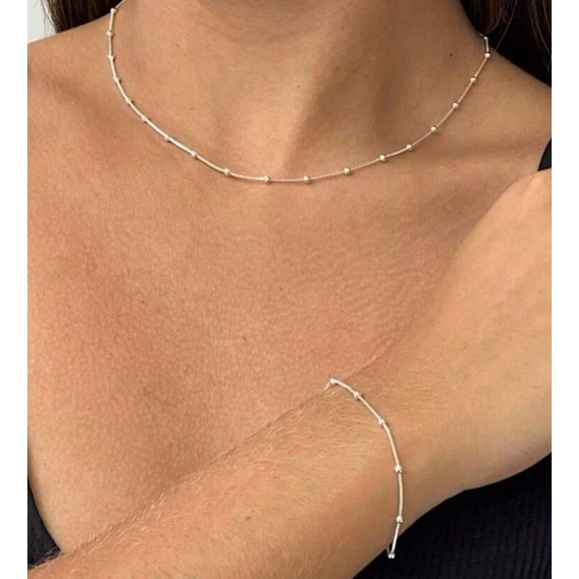 Kit 3 Colar simples feminino pulseira de contas e tornozeleira banhado a ouro 18k prata 925
