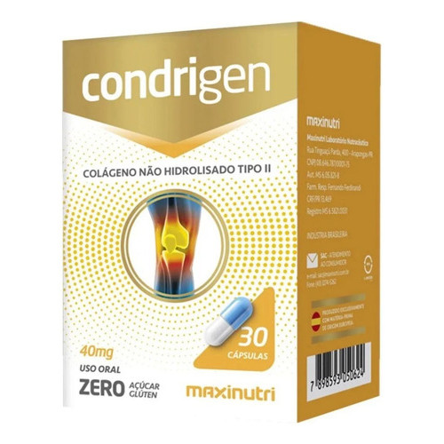 CONDRIGEN 40MG COLÁGENO NÃO HIDROLISADO TIPO 2 MAXINUTRI ENVIO IMEDIATO!!! Condrigen (Colágeno Não Hidrolisado Tipo II) Maxinutri 40mg - Produzido exclusivamente com matéria-prima europeia - Ajuda a melhorar o equilíbrio da cartilagem articular, para a redução da dor e melhorando a mobilidade do paciente, através do estímulo da produção de citocinas inibitórias da inflamação. ZERO AÇÚCAR ZERO GLÚTEN SUGESTÃO DE USO: Ingerir 1 cápsula com água em jejum. Conservação: Preservar em temperatura ambiente, proteger da luz e manter em local seco. Rendimento: 90 porções. Advertência "Gestantes, nutrizes e crianças até 3 (três) anos, somente devem consumir este produto sob orientação de nutricionistas ou médico."