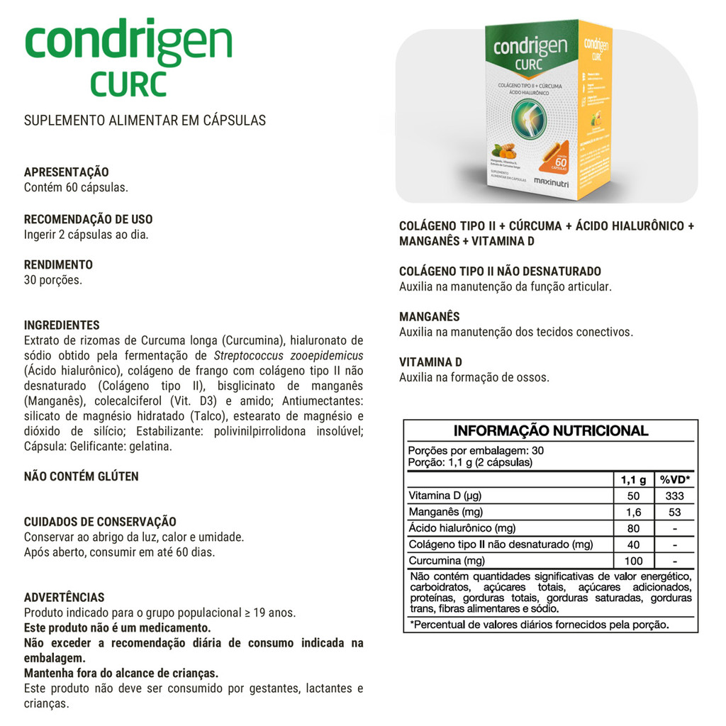 Estamos há mais de 5 anos no mercado, oferecendo produtos originais com procedência e garantia de fábrica. Com suplementos e nutracêuticos formulados com ingredientes de alta qualidade proporcionam resultados eficazes para saúde e bem-estar. Tenha mais energia, imunidade e disposição com nossos produtos. Conheça nossa linha completa! Infornações: Vitamina D 2.000 UI - auxilia na formação dos ossos. Manganês - Auxilia na manutenção dos tecidos conectivos. Colágeno Tipo II não desnaturado - Auxilia na manutenção da função articular. Conservação: Preservar em temperatura ambiente, proteger da luz e manter em local seco. Advertência Gestantes, nutrizes e crianças somente devem consumir este produto sob orientação de nutricionistas ou médico. Autorização Ministério da Saúde 6.05821-8 Farmacêutico Responsável CRF/PR 13.469