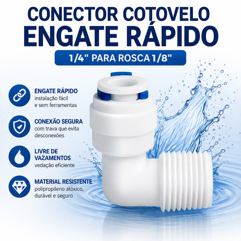 O Conector Cotovelo de Engate Rápido 1/4 com Rosca Macho 1/8 é um componente essencial para quem busca praticidade, segurança e eficiência em sistemas de condução e tratamento de água. Fabricado em polipropileno de alta densidade, este item oferece excelente resistência química e garante a total pureza do fluido, sendo ideal para instalações residenciais, comerciais e industriais. Sua tecnologia de engate rápido permite uma montagem manual simples e intuitiva, dispensando o uso de ferramentas complexas, colas ou soldas. Isso facilita tanto a instalação inicial quanto as manutenções periódicas para troca de filtros, mangueiras ou componentes do sistema. Aplicações e Compatibilidade: Este conector é extremamente versátil e atende a uma ampla gama de necessidades: Purificadores de Água: Compatível com modelos que utilizam mangueira de 1/4, como aparelhos das marcas Soft Everest, IBBL, Electrolux e Consul (importante verificar a medida da mangueira do seu modelo específico). Sistemas de Osmose Reversa: Peça fundamental para a conexão de carcaças de membrana, pós-filtros e tanques de armazenamento de água pura. Aquarismo: Essencial na montagem de sistemas de filtragem por deionização (DI) e sistemas de reposição automática de água doce ou salgada, garantindo segurança para o ecossistema do aquário. Jardinagem e Hidroponia: Ideal para a criação de redes de irrigação de precisão, microaspersão em hortas suspensas e sistemas de alimentação de nutrientes. Filtros de Fluxo Contínuo: Utilizado para direcionar o fluxo de água até a torneira de água potável ou entre estágios de filtragem. Equipamentos de Bebidas: Aplicação em máquinas de café expresso, máquinas de gelo, chopeiras e refresqueiras. Benefícios do Produto: Praticidade Extrema: Sistema de encaixe rápido por pressão que economiza tempo e esforço na montagem. Segurança contra Vazamentos: Acompanha trava de segurança (azul) que bloqueia o mecanismo e impede a desconexão acidental do tubo. Durabilidade e Higiene: Material atóxico de grau alimentício, resistente à pressão e ideal para o contato constante com água. Design em Cotovelo: O ângulo de 90 graus permite otimizar o espaço em locais compactos, evitando que as mangueiras sofram dobras ou estrangulamentos. Ficha Técnica Produto: Conector Cotovelo Engate Rápido Medida Conexão Tubo: 1/4 polegada Medida Conexão Rosca: 1/8 polegada Macho (Padrão NPT/BSP) Material: Polipropileno (PP) de alta resistência Cor: Branco com trava azul Temperatura de Operação: 5 a 35 °C Pressão Máxima Suportada: 5 bar (aproximadamente 72 PSI) Compatibilidade de Fluido: Água potável e líquidos alimentares Conteúdo da Embalagem 01 Conector Cotovelo Engate Rápido 1/4 x Rosca Macho 1/8 01 Trava de Segurança para Engate Rápido Dicas de Instalação Para garantir a melhor performance e evitar vazamentos, certifique-se de que o corte do tubo de 1/8 esteja perfeitamente reto e sem rebarbas. Insira o tubo firmemente até o fundo do conector antes de posicionar a trava de segurança azul. Nas conexões de rosca, recomenda-se sempre o uso de fita veda rosca para assegurar um selamento perfeito e duradouro.