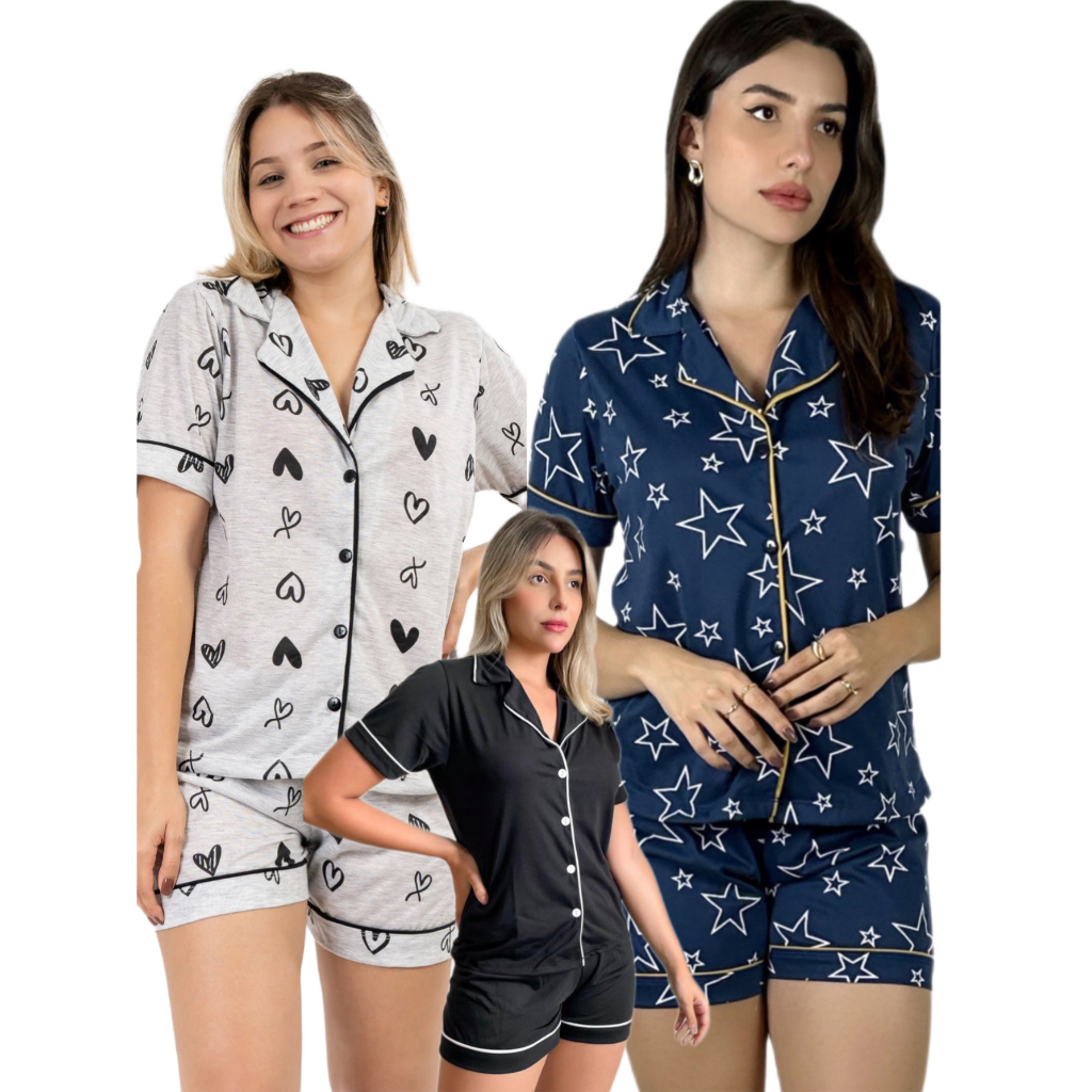 Kit 3 conjuntos Pijama americano Short doll Amamentação Com abertura de Botões Blogueira Malha Verão