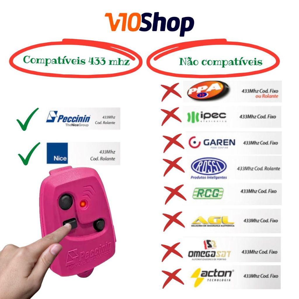 Bem vindo(a) a V10 SHOP !! MATERIAL COM NOTA FISCAL Kit 3 unidades do Controle Remoto Para Portão Peccinin Preto TX 3C Nice - Rosa O CONTROLE MAIS SEGURO DO BRASIL. Transmissor de sinal codificado que impossibilita a clonagem do 3C, oferecendo maior alcance sem interferência. Acompanha opção de clipe e laço para chaveiro. Segurança a toda prova! Especificações Técnicas Ressonador Saw; 3 botões de Comando; Rolling Code; Frequência 433,92Mhz O Controle Da Peccinin serve para toda linha de portões das marcas PECCININ e NICE com menos de 8 anos e sua configuração e super simples o manual vem na parte interna da caixa. Tenha tranquilidade de comprar com quem está disposto a te oferecer o melhor atendimento, caso tenha algum problema após a compra, conte com nossa equipe de pós-venda para solucioná-lo! Oferecemos produtos de alta tecnologia dos maiores fabricante do Brasil e do mundo. Estamos sempre a disposição para tirar qualquer dúvida. Aguardamos seu pedido :)