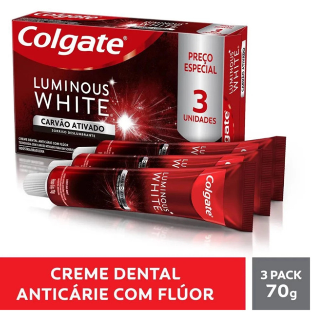 | Kit 3 Creme Dental Colgate Luminous White Clareador Carvão Ativado ... este produto | R$ 29,90 | 40% | 4.9/5 | 106 |