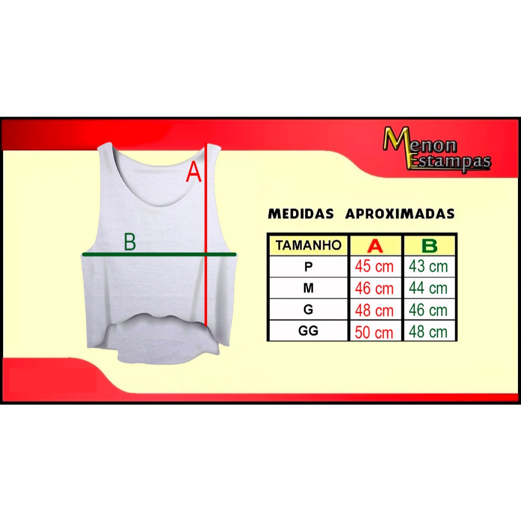 Cropped Feminina Academia Fitness Promoção Tamanho P 46cm largura 45cm Altura Tamanho M 47cm largura 46cm Altura Tamanho G 48cm largura 47cm Altura Tamanho GG 49cm largura 48cm Altura camisetas Croppeds academia, treino e dia a dia Perfeita para incrementar seu visual nas academias ou durante exercícios ao ar livre, a O nosso Cropped foi confeccionado para proporcionar mais liberdade de movimentos e conforto. Camisa super macia e confortável malha 100% Poliéster Estampa feita com técnica de sublimação A estampa não mancha, não sai com lavagem e é altamente durável. Temos tamanho P, M, G e GG.