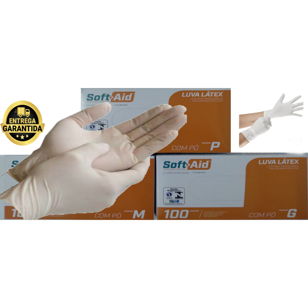 DESCRIÇÃO DO PRODUTO KIT 3 CX de luva látex com Pó = 300 UNIDADES Nesta formar de venda ( KIT) cada unidade sai a $23,30 O MENOR PREÇO DA PLATAFORMA LUVA E DA MARCA ( SOFT + AID ) BOMPACK * COM UMA NOVA EMBALAGEM MUDANDO APENAS O NOME FANTASIA PARA ( SOFT + AID ) * COM A MESMA QUALIDADE * COM TODOS OS SELOS DE EXPECIFICAÇÕES EXIGIDOS PELAS NORMAS NACIONAIS KIT COM 3 CAIXAS COM 100 UNIDADES TOTAL 300 UNIDADES TAMANHO =PP, P,M,G Luvas de procedimento ( SOFT + AID ) BOMPACK feita em látex levemente talcada, são indispensáveis para proteção individual em procedimentos não invasivos, utilizadas por médicos e enfermeiros para evitar contatos com materiais contaminados. Não são indicadas para contato com substâncias químicas altamente agressivas.