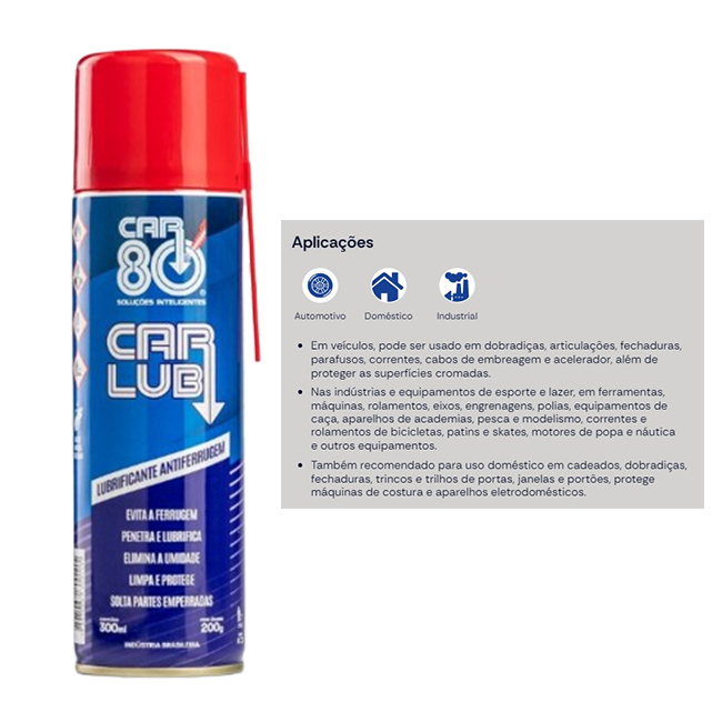 Car Lub Desengripante Car80 300ml Características: É um lubrificante antiferrugem multiuso, desenvolvido especialmente para proteger, lubrificar e desengripar elementos metálicos contra ferrugem e corrosão, através de aplicações regulares mantém uma película protetora agindo contra as ações do tempo. Dúvidas frequentes: O Produto é novo? Sim. Nós trabalhamos apenas com produtos novos e com garantia. O Produto é original? O produto é 100% Novo e Original com Nota Fiscal! Em quanto tempo recebo minha compra? Seus produtos serão enviados no mesmo dia após a confirmação do pagamento. (Exceto sábado, domingo e feriados) Possuem loja física? Nós somos a Pinho Diesel e Ferramentas, localizada no CADEG no Rio de Janeiro. Nos acompanhe nas redes sociais ou entre em contato com um de nossos vendedores. Tem alguma dúvida sobre o produto ou sobre a compra? Deixe sua pergunta abaixo, que responderemos prontamente.