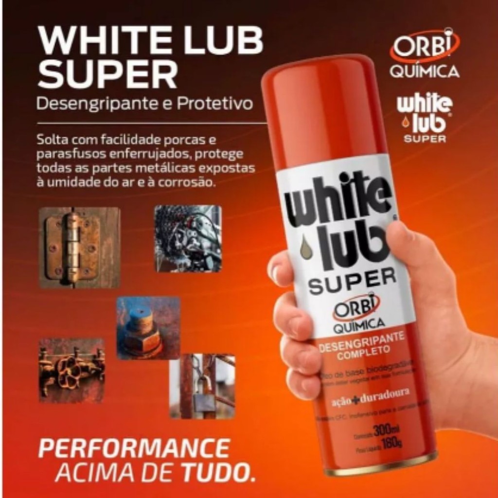 Descrição do produto Desengripante Antiferrugem Lubrificante Multiuso | Orbi Quimica WHITE LUB SUPER 300ML WHITE LUB SUPER possui uma formulação exclusiva que o torna um desengripante e antiferrugem de propriedade protetiva. Com excelente performance, age onde há necessidade de proteção contra efeito da oxidação em materiais, equipamentos e superfícies metálicas. Solta com muita facilidade porca e parafusos enferrujados, protege todas as partes metálicas expostas à umidade do ar e à corrosão. • DESEMPENHO INCOMPARÁVEL • PRODUTO LÍDER DE MERCADO EM SEU SEGMENTO • DE FÁCIL APLICAÇÃO