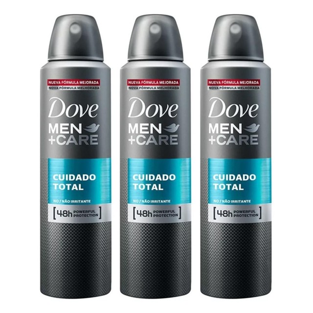 Kit 3 Desodorante Aerossol Dove Men Care Cuidado Total 150ml O Desodorante Aerosol Dove Men+Care Proteção Total protege contra o suor e mau odor, o mantendo seco o dia inteiroDesodorante aerosol projetado para 72h de proteção contra o mau odor, com uma fragrância refrescante e de longa duraçãoEste desodorante é formulado com tecnologia Tripla Ação que ajuda a proteger a pele, reduzindo o risco de irritaçõesDesodorante aerosol para homens com 1/4 de creme hidratante que é forte contra o mau odor e suave na peleDesodorante ideal para homens que, além de hidratar a pele, contém uma agradável fragrância que a mantém refrescada e seca o dia todo