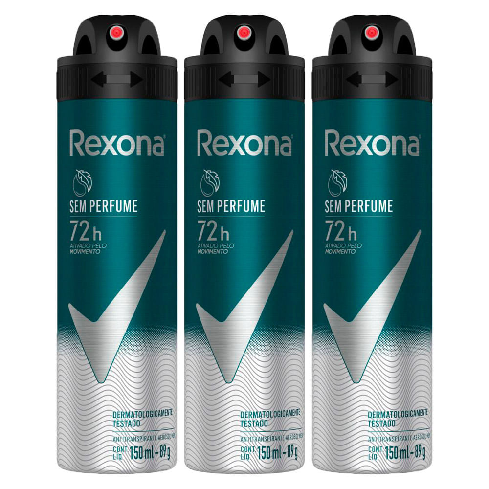 Kit 3 Desodorante Antitranspirante Aerosol Masculino Rexona Sem Perfume 72 horas 150ml