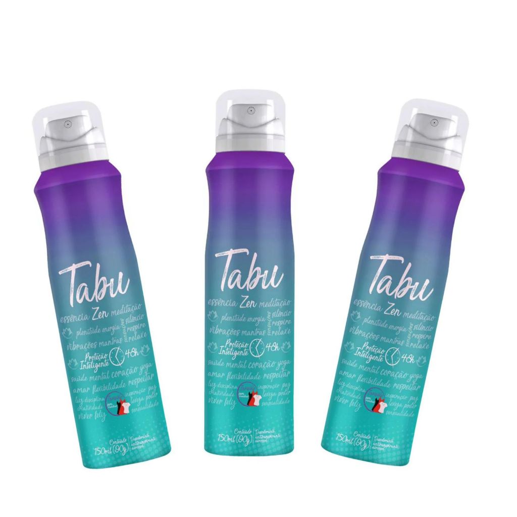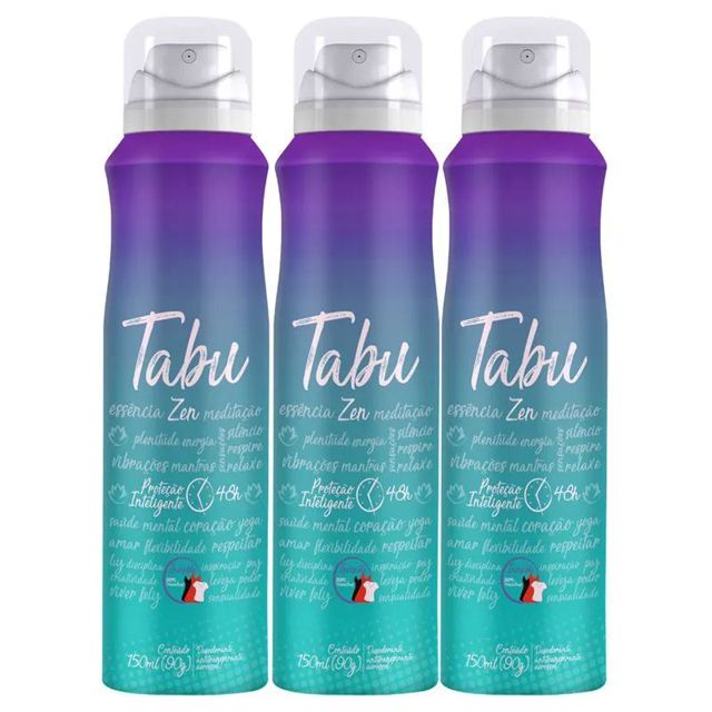 O Kit com 3 Desodorantes Tabu Proteção 48 Horas é ideal para quem busca cuidado diário, perfumação marcante e proteção prolongada. Com a fragrância Essência Zen Meditação, combina notas suaves e envolventes que proporcionam sensação de bem-estar, equilíbrio e frescor ao longo do dia. Sua fórmula oferece até 48 horas de proteção contra odores, ajudando a manter a pele seca e confortável. Conta com proteção inteligente, que auxilia no controle da transpiração e garante segurança mesmo em rotinas intensas. Com textura leve e secagem rápida, não deixa resíduos visíveis e é fácil de aplicar. O kit é perfeito para ter sempre à mão em casa, na bolsa ou para garantir reposição por mais tempo. Conteúdo: 3 desodorantes aerossol de 150 ml (90 g) cada.