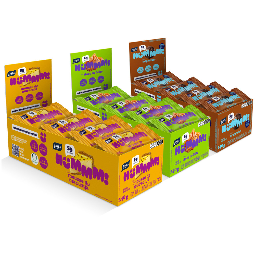 Hummm! é a barrinha de proteína com a Marca Linea de qualidade que chegou para provar que ser saudável também pode ser extremamente gostoso. Com 9 diferentes e irresistíveis sabores, você encontra Hummm! em opções de 20g ou 35g. 1 Kit composto por: 1 Caixa de 12 de Unidades Hummm! Snack Proteico Sabor Brigadeiro 20g (cada); 1 Caixa de 12 de Unidades Hummm! Snack Proteico Sabor Doce de Leite 20g (cada); 1 Caixa de 12 de Unidades Hummm! Snack Proteico Sabor Mousse de Maracujá 20g (cada). INGREDIENTES SABOR BRIGADEIRO: Recheio sabor brigadeiro, cobertura ao leite, concentrado proteico de leite em pó (whey protein), concentrado proteico de soro de leite em pó (whey protein), gordura vegetal de palma, colágeno hidrolisado, nibs de cacau, cacau em pó, alfarroba em pó, edulcorante maltitol, umectante polidextrose, aromatizante, emulsificante lecitina de soja, conservador sorbato de potássio e antioxidante tocoferol. INGREDIENTES SABOR DOCE DE LEITE: Recheio sabor doce de leite, cobertura ao leite, concentrado proteico de leite em pó (whey protein), concentrado proteico de soro de leite em pó (whey protein), gordura vegetal de palma, colágeno hidrolisado, alfarroba em pó, edulcorante maltitol, umectante polidextrose, emulsificante lecitina de soja, corantes: carvão vegetal, extrato de páprica, vermelho beterraba e curcumina, aromatizante, conservador sorbato de potássio e antioxidante tocoferol. INGREDIENTES SABOR MOUSSE DE MARACUJÁ: Cobertura branca, recheio sabor mousse de maracujá, concentrado proteico de leite em pó (whey protein), concentrado proteico de soro de leite em pó (whey protein), gordura vegetal de palma, colágeno hidrolisado, edulcorante maltitol, umectante polidextrose, aromatizante, corante curcumina, emulsificante lecitina de soja, acidulante ácido cítrico, conservador sorbato de potássio e antioxidante tocoferol. ALÉRGICOS: CONTÉM DERIVADOS DE LEITE E SOJA. PODE CONTER OVOS, AMENDOIM, AVELÃS, CASTANHA-DE-CAJU, CASTANHA-DO-PARÁ E NOZES. CONTÉM LACTOSE. NÃO CONTÉM GLÚTEN.