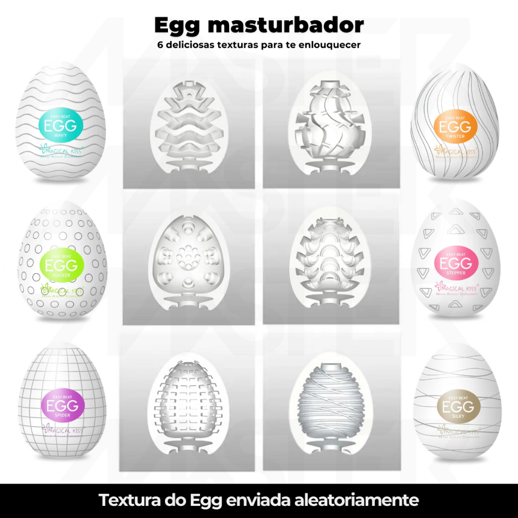 TEXTURAS ENVIADAS ALEATORIAMENTE, CONFORME DISPONIBILIDADE EM ESTOQUE. Feito para homens que querem praticar a masturbação, sem perder a sensação de realismos, e com novas sensações que farão a loucura. Com ele você tem texturas diferentes para que possa experimentar novas sensações, deixando seu momento íntimo ainda mais gostoso. Como inovar a masturbação? Os eggs masturbadores são eggs com diferentes padrões de texturas, ele foi desenvolvido em material cyberskin, que simula pele humana, fazendo com que a masturbação masculina se torne mais real e mais gostosa. Esses ovos prometem levar a masturbação masculina a um novo patamar, com texturas que garantem a elevação do prazer e um leque de sensações realísticas. Escolha o seu garanta muito prazer. Quais os benefícios do EGG? • Masturbação silenciosa; • Fácil de utilizar; • Segurança e conforto no uso; • Desenvolvido em material realístico. Ficha Técnica • Contém: 03 ovos masturbadores (Texturas aleatórias) • Validade: Indeterminada; • Embalagem: Plástica. Qual a composição do EGG? Os EGGs são confeccionados em material TPE + ABS. (Não tóxico). Como usar o Egg? Abra a embalagem em forma de casca, dentro dela terá uma peça de silicone que imita um ovo, ela é oca e com um orifício na base, aplique o lubrificante, e encaixe a base no pênis, e a partir daí é só iniciar a brincadeira, e se saborear com as sensações que as texturas irão te causar. Como Higienizar o Egg? Antes e depois de usar, faça a higienização com água corrente e sabão neutro, fazendo movimentos para ensaboar o acessório. Após a lavagem, seque com papel toalha ou naturalmente, ao abrigo do calor e luz excessiva. Quando estiver totalmente seco, guarde-o em sua embalagem original. Quais cuidados e precauções preciso ter ao usar o Eggs? • Sempre faça a higienização, antes e depois do uso; • Sempre faça a secagem do produto após a lavagem; • Não expor o produto a temperatura superior a 50ºC; • Para guardar utilize a embalagem original do produto; • Zonas inflamadas, inchadas ou pele com lacerações, não utilizar o produto, pois pode ocorrer agravamento de patologias já existentes ou lesões. • Recomenda-se o uso de lubrificante. Atenção: Algumas das embalagens podem sofrer alterações por parte do fornecedor, permanecendo as características do produto, tais como: função, composição, peso e quantidade, sem tempo hábil para serem atualizadas.