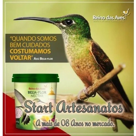 Lindo kit 3 em com 3 Produtos de Alta qualidade 02 bebedouros para Beija-Flores, Mais 01 Pote de Néctar para beija Flores 250 g marca Reino das Aves Com tudo de bom! e segurança que os pássaros precisam para se alimentar. Compra inteligente! %%Você economiza no frete !%% Com este Kit é Só Chegar e colocar, Decore sua casa e receba lindas visitas!!! Composto por um reservatório para água e 4 lindas flores nos locais de saída da água. Ideal para decorar jardins e Varandas atraindo pássaros que farão deles seu local favorito. Ajude a Natureza!! Estudos mostram que o fornecimento de alimento e abrigo para aves silvestres tem resultados positivos! por Exemplo: nas decisões, comportamentos e reprodução das aves. Uma descoberta importante é que o fornecimento de alimento e Abrigo para aves no inverno aumenta as taxas de sobrevivência , pode encorajar elas a pôr ovos no início do ano e também pode melhorar a sobrevivência dos ninhos. Todos esses fatores alteram para melhor o desempenho reprodutivo e o futuro das espécies e podem aumentar a abundância total de pássaros Livres, na natureza!! Especificações: Capacidade de água: 250 ml Material: Plástico Animal: Pássaro 1 pote 250 g Néctar Reino das aves Dimensões: Altura: 20cm OBS.: Imagem meramente ilustrativa Cores podem variar de acordo com disponibilidade de estoque. - Tudo a Pronta Entrega. ::: PRAZO DE ENVIO Dependendo do horário, enviamos no mesmo dia, ou no máximo em até 24h (Em dias úteis) após a confirmação do pagamento. ::: ATENDIMENTO Caso tenha dúvidas, utilize o campo de perguntas. Possuímos uma equipe altamente qualificada para respondê-las rapidamente. ::: PÓS-VENDA Não tenha dúvidas! Nós vendemos BEM para vendermos SEMPRE! Conte com nosso atendimento em horário comercial sempre que precisar. ::: DICAS DE COMPRA 1. Leia todo o anúncio antes de comprar. 2. Verifique se seus dados de contato estão atualizados no momento da compra. 3. Confira o seu endereço de recebimento, pois não temos como alterá-lo. Você fará uma excelente Compra!! Amamos o que fazemos e portanto fazemos cada vez melhor! Poucas unidades; edição Limitada. Garanta já o sua! Start Artesanatos. A mais de 10 anos no mercado ; temos experiencia e estamos entre os melhores vendedores para lhe oferecer uma excelente experiência de compra Online com a garantia e 100% na nota fiscal; receba o que comprou ou seu dinheiro de volta.