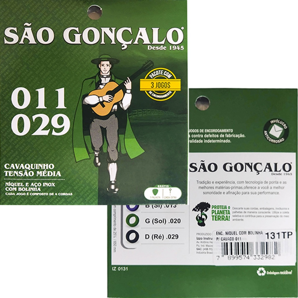 Olá, seja bem-vindo à HGZ Music Store Está em busca de um encordoamento 011 com tensão média para Cavaquinho, para seu tão amado instrumento? A HGZ Music Store traz o Encordoamento São Gonçalo para atender sua necessidade! O mesmo Encordoamento São Gonçalo para Cavaquinho que você já conhece, agora no Pack com 3 jogos completos de cordas para o seu instrumento! Encordoamento em aço inoxidável com bolinha, revestido com níquel, tensão média, afinação precisa e durável. Produto Original fornecido pela Izzo Instrumentos Musicais. Tipos de Instrumento onde se pode utilizar: Cavaquinho Calibre da Cordas (Bitola/Espessura): 1 - Ré .011 2 - Si .013 3 - Sol .020 4 - Ré .029 Características do Produto Material: Aço Inoxidável Revestimento: Níquel Tensão: Média Cor: Niquelada Com Bolinha O que você está comprando: 3 Encordoamentos Tensão Média com Bolinha para Cavaco - 131 3 Cordas Sol (G - terceira corda) Extra 3 Palhetas 1 Nota Fiscal Eletrônica Somos a HGZ Music Store, uma empresa totalmente focada em e-commerce no ramo de Instrumentos Musicais, sempre oferecendo as melhores marcas de equipamentos do mercado e com a devida expertise ao implementa-los ao nosso catálogo. Sua experiência será a de uma compra segura e garantida pelas melhores tecnologias de operação do mercado e entrega rápida! Caso tenha ficado alguma dúvida, nossa equipe estará pronta para te atender! HGZ Music Store