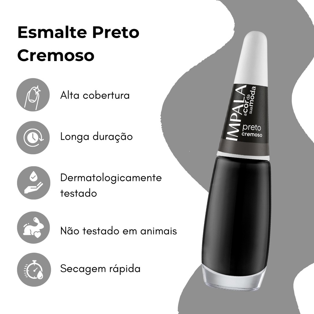 Quer unhas poderosas, com atitude e cheias de estilo? O Esmalte Impala Coleção A Cor Da Sua Moda Cor Preto Cremoso é a escolha ideal para quem ama um visual marcante, elegante e versátil. Um clássico que nunca sai de moda e combina com tudo! Sobre o produto: - Marca: Impala. - Linha: A Cor Da Sua Moda. - Conteúdo: 7,5 ml. - Brilho intenso. - Alta cobertura. - Longa duração. - Secagem rápida. - Não testado em animais. - Dermatologicamente testado. O que faz: - Acabamento Elegante, Deixa suas unhas com um acabamento brilhante e sofisticado. - Durabilidade: Garante horas de esmaltação sem perder o brilho ou a cor. - Fácil de Retocar: Sua fórmula permite retoques fáceis e rápidos, mantendo as unhas sempre perfeitas. Indicado para: - Profissionais de manicure e pedicure. - Cuidados pessoais em Casa. Modo de uso: - Agite bem antes de usar. - Aplique o esmalte sobre as unhas após o uso de uma base da sua preferência. - Comece a esmaltação pelo centro e, em seguida, preencha as laterais. - Se desejar aplique uma segunda camada de esmalte. - Use um palito com algodão umedecido em removedor para limpar o excesso do esmalte. - Finalize com um secante da sua preferência. Precauções de uso: - Não expor ao calor/luz solar, não ingerir. - Manter fora do alcance das crianças. - Usar somente em adultos, não usar sobre a pele irritada ou lesionada. - Em caso de irritação, suspender o uso e procurar orientação médica. Com cor intensa, acabamento cremoso e aplicação fácil, o Esmalte Impala Preto Cremoso é o toque final que seu look merece. Garanta já o seu e conquiste unhas impactantes com muito estilo e personalidade! Surgiu alguma dúvida? Entre em contato com a gente! Boas Compras :)