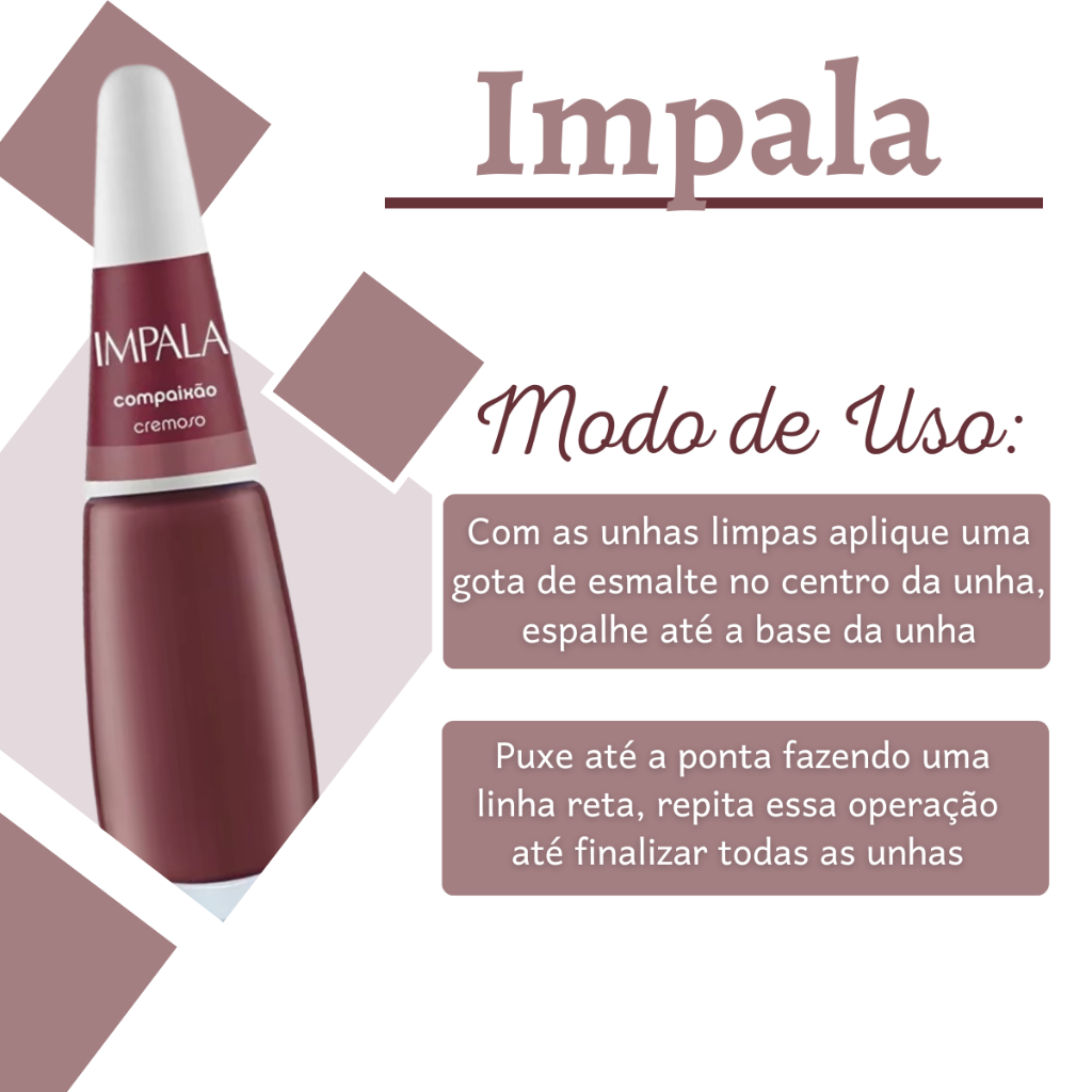 Nós da Armazém da Juju temos a missão de garantir a satisfação total do nosso cliente. Visando satisfazer e buscar melhorar a cada dia, focando na qualidade do atendimento, na variedade de produtos e no preço justo. Todos nossos produtos comercializados tem um PRAZO DE VALIDADE PROLONGADO, evitando assim o vencimento do produto a curto prazo. Caso tenha algum problema após a compra, conte com nossa equipe de pós-venda para solucioná-lo. _____________________________________________________ KIT 3 ESMALTES IMPALA TERRACOTA E VERNIZ EXTRA BRILHO A linha de Esmaltes Impala traz cores que te acompanham em todas as ocasiões. São inúmeras tonalidades que vão do clássico ao mais descolado e fashion, além dos lançamentos que sempre retratam o melhor da moda e tendência nacional e internacional. Assim, sempre terá um esmalte Impala que combine com seu look e deixe suas unhas ainda mais bonitas. Com alta cobertura, longa duração, brilho intenso e secagem rápida, os esmaltes Impala são perfeitos para te acompanhar em diferentes propostas de looks e combinações. Além disso, a fórmula Impala é dermatologicamente testada e nenhum de nossos produtos são testados em animais. MODO DE USO: Agite bem antes de usar. Aplique o esmalte sobre as unhas após o uso da base. Comece a esmaltação pelo centro e, em seguida, preencha as laterais. Se desejar aplique uma segunda camada de esmalte. Use um palito com algodão umedecido em removedor para limpar o excesso do esmalte. Finalize com um secante. É interessante saber: Alta cobertura Longa duração Brilho intenso Secagem rápida Dermatologicamente testado Estamos sempre à disposição para tirar qualquer dúvida. Aguardamos seu pedido!