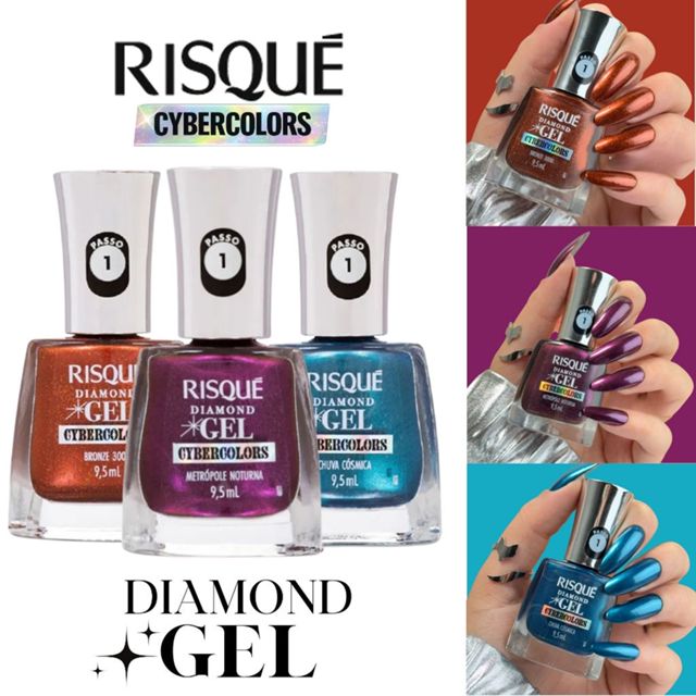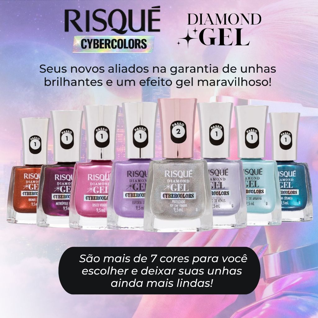 | Kit 3 Esmaltes Risqué Diamond Gel Lançamento Coleção Cybercolors Ef... este produto | R$ 41,90 | 19% | 4.9/5 | — |