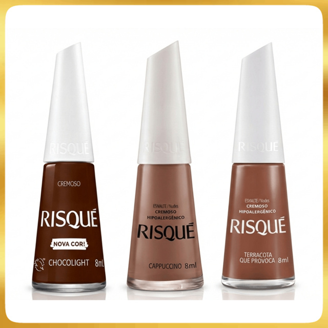 | Kit 3 Esmaltes Risqué Novas Cores Cremosas Tons Terrosos Marrom este produto | R$ 9,69 | 51% | 4.9/5 | 248 |