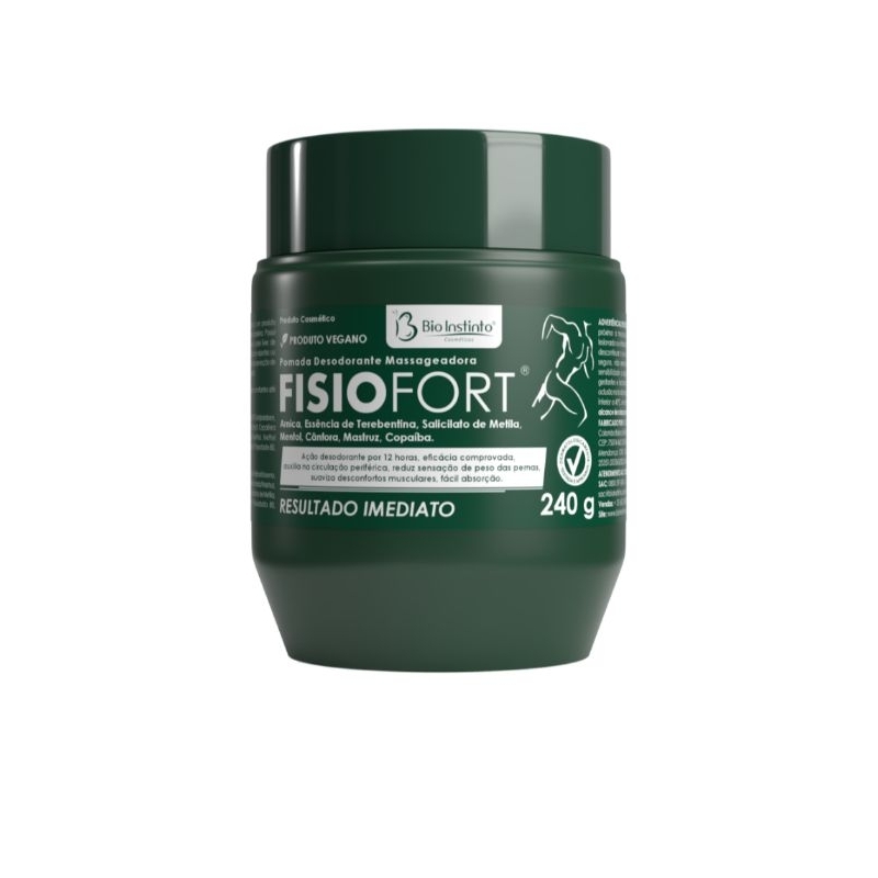 Fisiofort é uma pomada desodorante massageadora rica em ingredientes rubefacientes que aceleram a circulação periférica e promovem relaxamento e conforto corporal. Sua fórmula de fácil absorção contém Arnica, essência de Terebentina, Salicilato de Metila, Mentol, Cânfora, Mastruz e Copaíba.