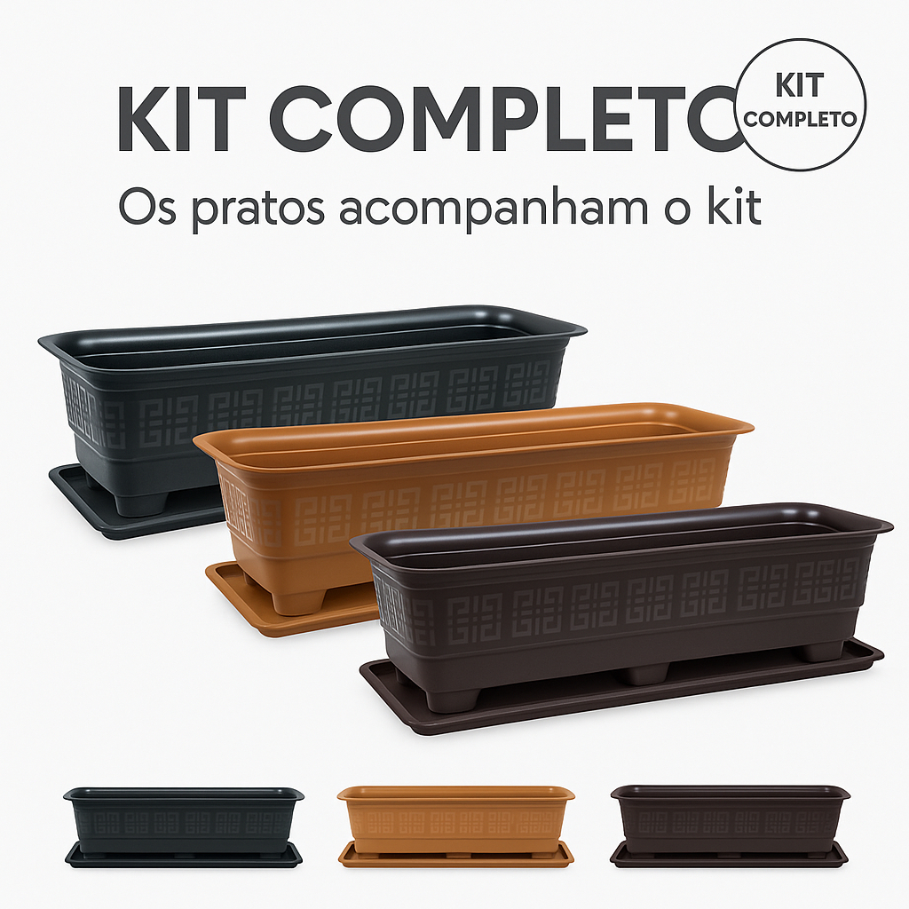KIT COMPLETO – 3 Floreiras Retangulares + 3 Pratos de BRINDE ✔ Medidas: 44,5 x 19 x 14 cm – Capacidade 6L cada ✔ Disponível em 3 cores: Preto, Terracota e Café ✔ Ideal para flores, temperos e hortaliças ✔ Material resistente, fácil de limpar e design moderno ✔ Perfeito para varandas, janelas, jardins e hortas caseiras Transforme sua varanda, jardim ou espaço interno com praticidade e estilo! Nossas floreiras retangulares são perfeitas para flores, temperos, hortaliças ou plantas ornamentais. Com design moderno e material resistente, acompanham pratos na mesma cor para evitar sujeira e manter o ambiente sempre limpo. ✅ Benefícios do Produto KIT COMPLETO: 3 floreiras + 3 pratos Capacidade: 6 litros cada Disponível em 3 cores elegantes: Preto, Terracota e Café Ideal para flores, temperos e hortaliças Design moderno com acabamento diferenciado Material resistente e de fácil limpeza Mantém seu ambiente organizado e bonito 📏 Medidas aproximadas da floreira Comprimento: 44,5 cm Largura: 19 cm Altura: 14 cm Capacidade: 6 litros 🎨 Cores disponíveis Preto Terracota Café 📦 O que você recebe 3 Floreiras retangulares da mesma cor 3 Pratos retangulares combinando 💡 Dica de uso Monte sua hortinha em casa, plante temperos como manjericão, salsa, cebolinha ou crie um espaço colorido com flores decorativas. Perfeito para varandas, áreas externas, janelas e jardins verticais. 👉 Compre agora o seu Kit Completo e leve mais verde e beleza para sua casa! 🌱 SEJA FELIZ CULTIVANDO ALEGRIA !!!!!!!