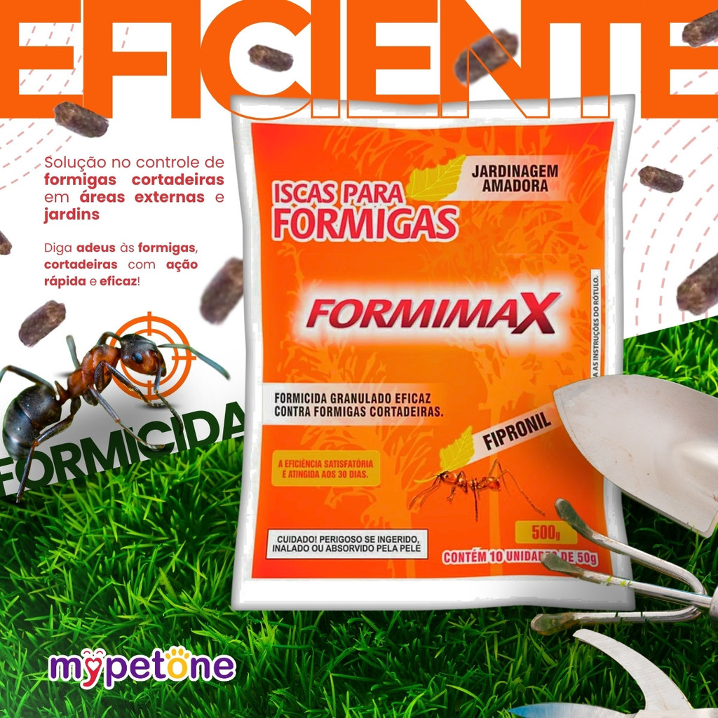 Formimax Isca Paletizada Citromax 500g A Formimax Isca Paletizada da Citromax é uma solução eficaz no controle de formigas cortadeiras em áreas externas e jardins. Com formulação atrativa e prática, o produto age diretamente no ninho, eliminando toda a colônia de forma segura e duradoura. Benefícios: - Controle eficiente: Atua no controle de formigas cortadeiras, como saúvas e quenquéns. - Ação sistêmica: A isca é levada pelas operárias até o formigueiro, atingindo a rainha e toda a colônia. - Fácil aplicação: Produto pronto para uso, sem necessidade de diluição ou preparo. - Alta atratividade: Paletização especial que aumenta a aceitação pelas formigas. Composição: Fipronil 0,003%, atrativos alimentares e veículo q.s.p. Modo de Uso: Aplicar diretamente sobre os carreiros ou nas proximidades do formigueiro, preferencialmente no final da tarde. Utilizar de 6 a 8g por metro linear de carreiro, sem colocar o produto diretamente sobre o monte do formigueiro. Informações Adicionais: - Conteúdo: 500g - Indicação: Controle de formigas cortadeiras em áreas externas - Marca: Citromax Elimine as formigas com eficiência usando o Formimax Isca Paletizada Citromax 500g — praticidade e eficácia no combate direto ao formigueiro!