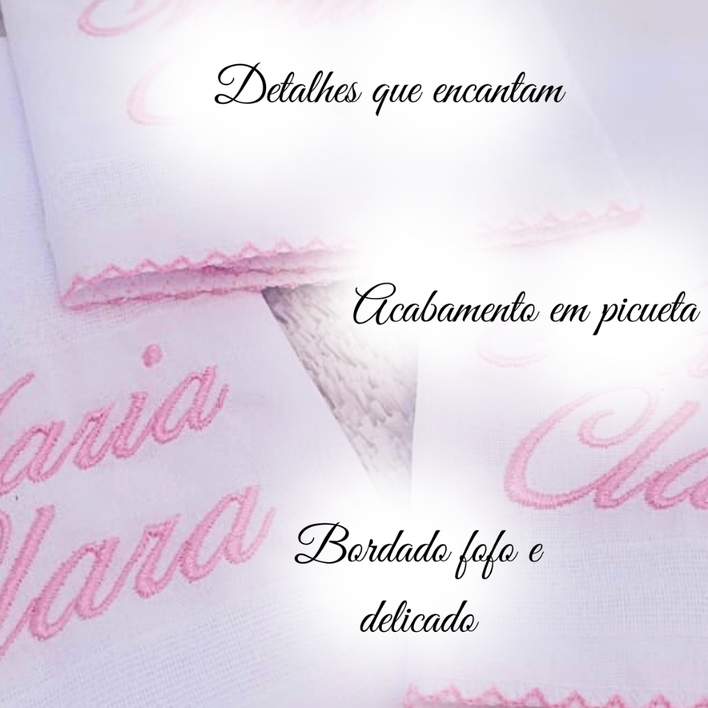 Encante-se com o nosso trio de fraldinhas de boca personalizadas, confeccionadas em tecido 100% algodão, garantindo maciez, absorção e conforto para a pele delicada do bebê. Cada fraldinha é bordada com o nome da criança e finalizada com um delicado acabamento em bico de picueta, proporcionando um toque artesanal e cheio de charme. Essas fraldinhas são ideais para o dia a dia, passeios, maternidade ou para presentear com carinho. Podem ser usadas para limpar o rostinho, proteger o ombro e acompanhar o bebê em todos os momentos. 📏 Medidas de cada fraldinha: 32 cm x 32 cm 🧵 Material: 100% algodão 🎀 Acabamento: Bico de picueta rosa 💖 Personalização: Nome bordado 👶 Conteúdo: Kit com 3 fraldinhas de boca 🌸 Destaques do produto Bordado personalizado apenas com o nome do bebê, não bordamos o sobrenome!!!! Toque suave, ideal para peles sensíveis Acabamento delicado e costura reforçada Produto artesanal feito com amor Perfeito para enxoval, maternidade e presente