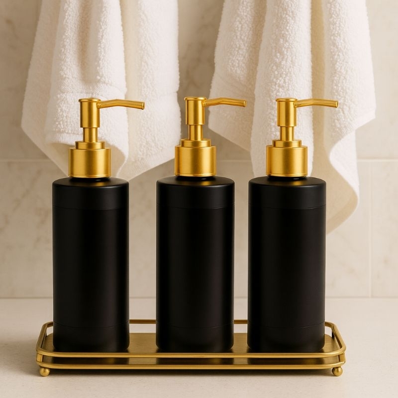 kit 3 Frasco Refil Luxo 500 ml com Válvula Dourada Recarregável e Resistente Fabricados em material resistente e de alta qualidade, ideais para armazenar e dosar produtos cosméticos e de higiene com praticidade e elegância. Podem ser utilizados para diversas finalidades, como shampoo, condicionador, sabonete líquido, hidratante, óleos capilares ou loções corporais. O design moderno com acabamento fosco e detalhes dourados adiciona um toque sofisticado a banheiros, lavabos, salões e espaços de estética. Conteúdo do kit: 3 frascos com válvula pump dosadora dourada Capacidade: 500 ml cada Uso: multifuncional (cosméticos, higiene, refil decorativo) Diferenciais: frasco resistente, elegante e reutilizável