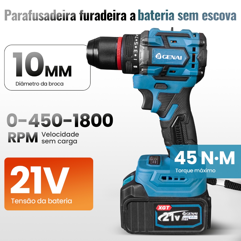 Esta é uma ferramenta de motor sem escova ! Kit com Furadeira de impacto + Chave de impacto!!! Detalhes técnicos: Potência: 21V Chave De Impacto: Diametro do parafuso: 6-26m Velocidade sem carga: 3200 Frequencia de impacto: 0-3800 Capacidade da bateria: 2000MAH Torque máximo: 520NM Furadeira de impacto: Diametro maximo do mandril: Ф10mm Torque maximo: 45N.m Velocidade sem carga:alta velocidade:0-1950r/ min Baixa velocidade:0-800r/min Luz brilhante: Chips de LED Lente projetada Equipado com bateria de lítio Características: Compacto e portátil / Cabeça de luz ajustável Itens inclusos: - 1x Chave de impacto - 1x Parafusadeira - 1x Luz - 1x Bocal para chave de impacto - 2x baterias 21V - 1x carregador