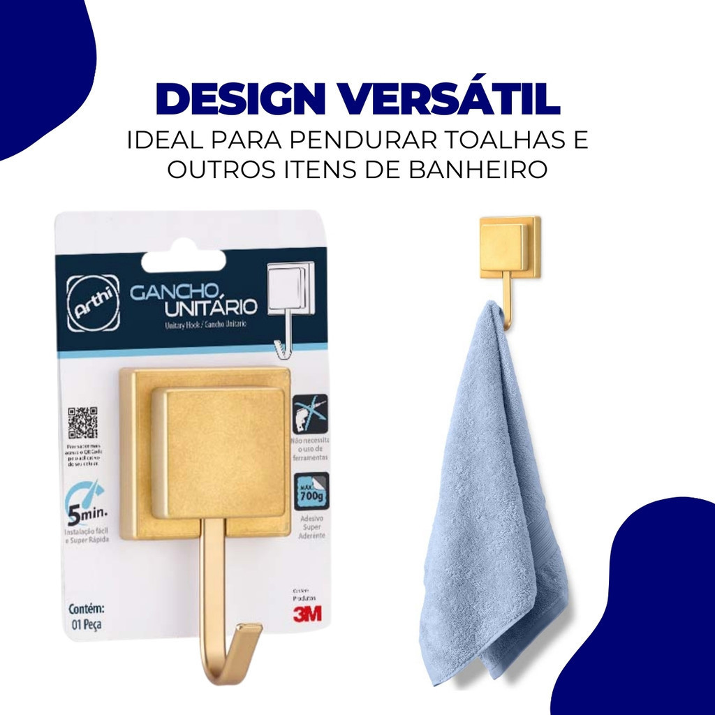 Kit 3 Gancho Cabide Suporte Porta Toalha de Parede Banheiro Cozinha 3M Dourado Fosco Arthi