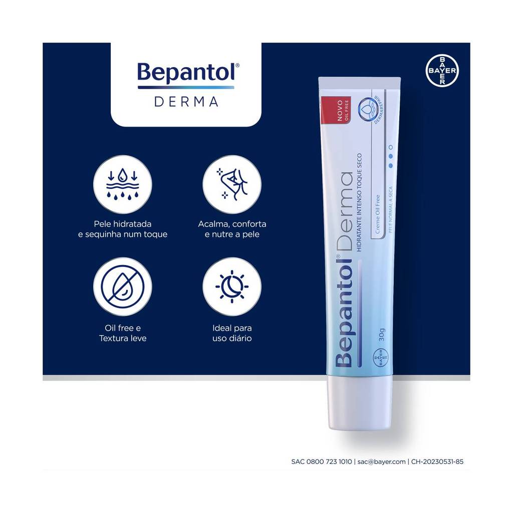 Kit com 3 Cremes Hidratante Facial e Corporal Toque Seco 30gr Cada - Bepantol Derma Bepantol Derma Toque Seco é um hidratante oil free, que oferece excelente eficácia para uma pele hidratada e sequinha em apenas um toque. Indicado para a rotina de hidratação e cuidado diário, ele pode ser usado a qualquer hora do dia. Por meio da tecnologia Dermarepair, o Hidratante Bepantol Derma Toque Seco penetra mais profundamente na pele com rápida absorção, garantindo uma hidratação mais intensa, além de preservar a água da pele. Para que serve o Hidratante Intenso Bepantol Derma Oil Free Pele Normal a Seca? Manter a rotina de hidratação é essencial para a saúde da pele. Bepantol Derma Toque Seco foi feito para ser usado a qualquer hora do dia e em áreas que merecem um cuidado especial como rosto, pescoço, mãos e tatuagens. Testado dermatologicamente, ele possui uma fórmula com alta concentração de pró-vitamina B5, o dexapantenol, que promove uma hidratação intensa e regeneração mais profunda da pele. Como usar o Hidratante Intenso Bepantol Derma Oil Free Pele Normal a Seca com 30g? Aplique uma fina camada do Hidratante Intenso Bepantol Derma Oil Free Pele Normal a Seca sobre a pele e espalhe delicadamente. Como funciona a tecnologia Dermarepair? A tecnologia Dermarepair vai além dos hidratantes convencionais, penetrando mais profundamente nas camadas da pele, para garantir uma hidratação mais profunda. Ela também atua na preservação da água na pele, gerando resultados impressionantes. É verdade que o Bepantol clareia a pele? Após seu lançamento e popularização, muitos usuários encontraram outras finalidades para o Bepantol Derma Creme. Embora a marca deixe explícito que o produto não possui ação clareadora, o creme pode ajudar a manter uma aparência mais saudável em manchas na pele, olheiras e marcas escuras nas axilas e virilha. Principais Características: - Hidratação com toque seco. - Alta concentração de pró-vitamina B5 (dexpantenol). - Fácil de espalhar e de rápida absorção. - Acalma, conforta e nutre a pele. - Hidrata e auxilia na restauração natural da pele. Especificações Técnicas: - Conteúdo da Embalagem: 3 Cremes Hidratante Toque Seco 30g Cada Bepantol Derma - Composição: Aqua, Panthenol Isopropyl Myriastate, Cetyl Alcohol, Stearyl Alcohol, Propilene Glycol, Lanolin, Potassium Cetyl Phosphate, Phenoxyethanol, Pantolactone, Potassium Hydroxide. - Garantia: 30 Dias Contra defeitos de fabricação pelo fabricante - Peso Liquido: 0,045kg cada 30g - Anvisa Nº 0661133 - Código do Fabricante: 86448017 - EAN: 7891106913522 - Marca: Bepantol Imagens meramente ilustrativas, as cores e estampas podem variar de acordo com o lote do fabricante.