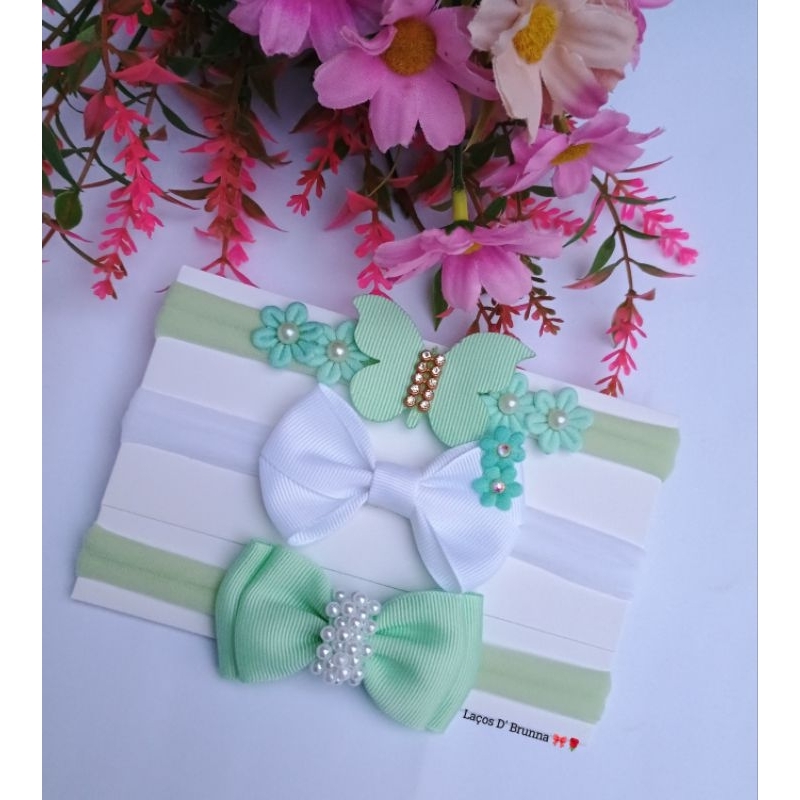 Kit 3 Laços infantil na Faixinha Tiara meia de Seda para bebê menina/Flores é Borboleta é Pérolas