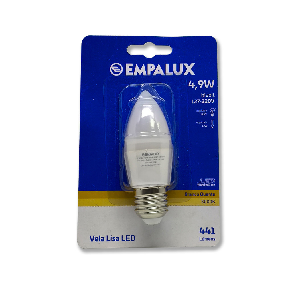Lâmpada Vela LED Leitosa 4.9W Bivolt 3000K – VL30523 A lâmpada vela LED leitosa é a escolha ideal para quem busca iluminação decorativa com eficiência energética. Com seu formato elegante e acabamento fosco, ela combina perfeitamente com lustres, pendentes e luminárias decorativas, criando um ambiente acolhedor com sua luz quente de 3000K. Características Técnicas: Código: VL30523 Tensão: Bivolt (110V/220V) Potência: 4.9W Fluxo Luminoso: 441 lúmens Temperatura de Cor: 3000K (luz amarela quente) IRC (Índice de Reprodução de Cor): >80 Base: E27 Selo Inmetro: Sim Vida útil estimada: 15.000 horas Garantia: 1 ano Dimensões: Comprimento: 105 mm Diâmetro: 37 mm