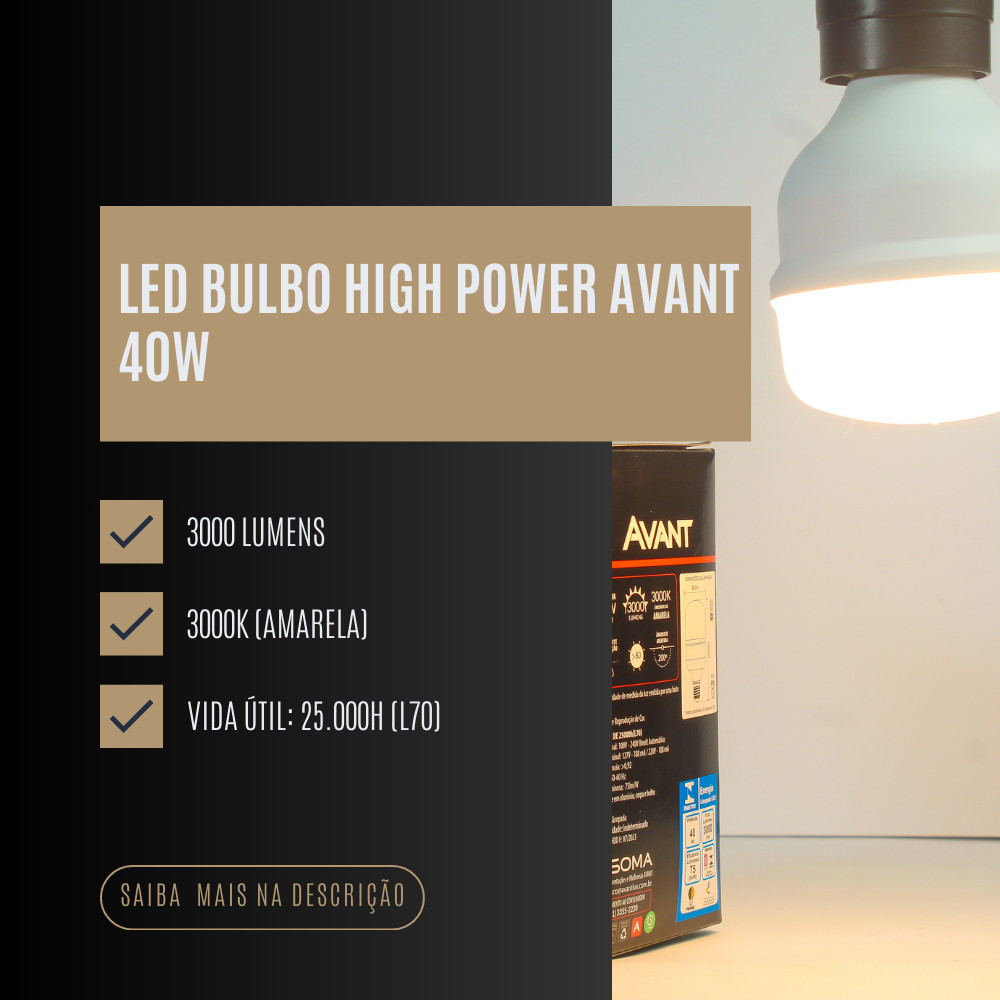 O que está adquirindo: Kit com 3 Lâmpadas LED Bulbo High Power Avant 40W – com fluxo luminoso de 3000 lúmens cada, temperatura de cor amarela 3000K, base E27 e funcionamento bivolt automático (100V – 240V). Ideais para iluminação de grandes áreas internas. Descrição do Produto: O Kit com 3 Lâmpadas LED Bulbo High Power Avant 40W é perfeito para quem busca alta potência luminosa, economia de energia e longa durabilidade. Cada lâmpada possui fluxo luminoso de 3000 lúmens e temperatura de cor amarela (3000K), proporcionando luz confortável e aconchegante, ideal para ambientes residenciais ou comerciais. Com base E27, funcionamento bivolt automático e vida útil de até 25.000 horas, são alternativas eficientes para substituir lâmpadas incandescentes ou fluorescentes de alta potência, oferecendo praticidade e excelente desempenho. Características Principais (por lâmpada): Potência: 40W Fluxo luminoso: 3000 lm Eficiência luminosa: 75 lm/W Temperatura de cor: 3000K (amarela) Ângulo de abertura: 200° IRC: >80 Base: E27 Vida útil: 25.000h (L70) Não dimerizável Especificações Técnicas (por lâmpada): Tensão elétrica: 100V – 240V (Bivolt automático) Corrente nominal: 127V ? 188 mA | 220V ? 108 mA Fator de potência: >0,92 Frequência: 50/60 Hz Dimensões: Ø80 mm x 120 mm Peso: 69 g Material: base em alumínio, corpo e bulbo em plástico Aplicações Recomendadas: iluminação de grandes áreas internas Substituição de lâmpadas de alta potência Uso em residências, comércios e escritórios secos e arejados Manuseio e Manutenção: Instalar em luminárias que permitam boa dissipação de calor Não utilizar em ambientes úmidos ou fechados Não usar com dimmers Sempre desligar a energia antes da instalação ou remoção Descartar em locais apropriados após o fim da vida útil SKU: Kit2674 Código interno: LED-BULBO-HP-IN-E27-AM3000K-40W-BIVOLT-MK3000-G-K2 Garantia: 12 meses contra defeitos de fabricação (mediante apresentação de nota fiscal ou cupom).