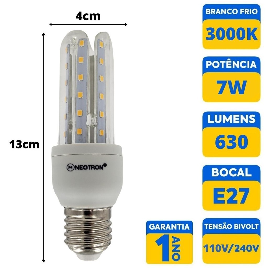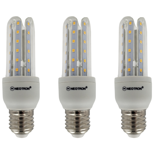 KIT 3 Lâmpadas LED Compacta 7W 3000K Luz Amarela Branca Quente Bivolt 110/220V 3U E27 NEOTRON 630 Lúmens - Decorativa Cozinha Casa Residencial Soquete Padrão Luminária Compacta Espiga Milho Formato U