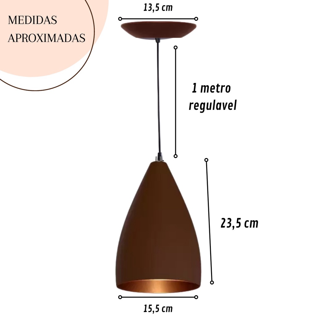 Kit 3 Luminárias Marrom e Cobre Pendentes VEGAS Decorações Internas E Externas Luminária pendente, lindas luminárias com acabamento de teto individuais Fabricada em alumínio. Material altamente resistente ao tempo. 100% Alumínio (não enferruja) Luminária composta por cabo PP com 1 metro de comprimento (tamanho Ajustável) soquete E27 canola e cúpula em alumínio. Luminária ideal para ambientes internos, utilizada em salas de estar, cozinhas, salas de jantar , área gourmet e entre outros ambientes. Luminária tradicional no mercado de iluminação. Pendente que se adapta perfeitamente em qualquer ambiente. Ilumine e decore o seu lar com nossas lindas luminárias. Deixe a imaginação tomar conta. Voltagem Bivolt (127/220)* Soquete E27 (Aplicável Com Lâmpada Comum Ou Led) Cabo PP 1,00m Regulável Material 100% Alumínio (Não Enferruja) EMBALAGEM SEGURA *Não Acompanha Lâmpada Medidas do pendente: Altura: 23,5 cm Diametro: 15,5 cm Cabo: 1,0 Mt POSSUIMOS ESSE KIT EM OUTRAS CORES E EM OUTRAS QUANTIDADES, CHAMAR NO CHAT PARA ADQUIRIR. *OS CABOS SÃO ENVIADOS DE ACORDO COM A DISPONIBILIDADE DE ESTOQUE!*
