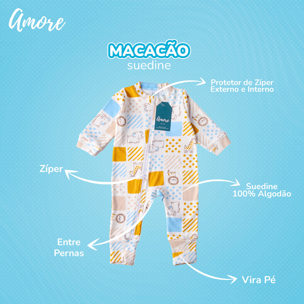 Kit 3 Macacão Bebe Amore Pé Reversível Clássico Menino Infantil RN ao GG Maternidade 100% Algodão