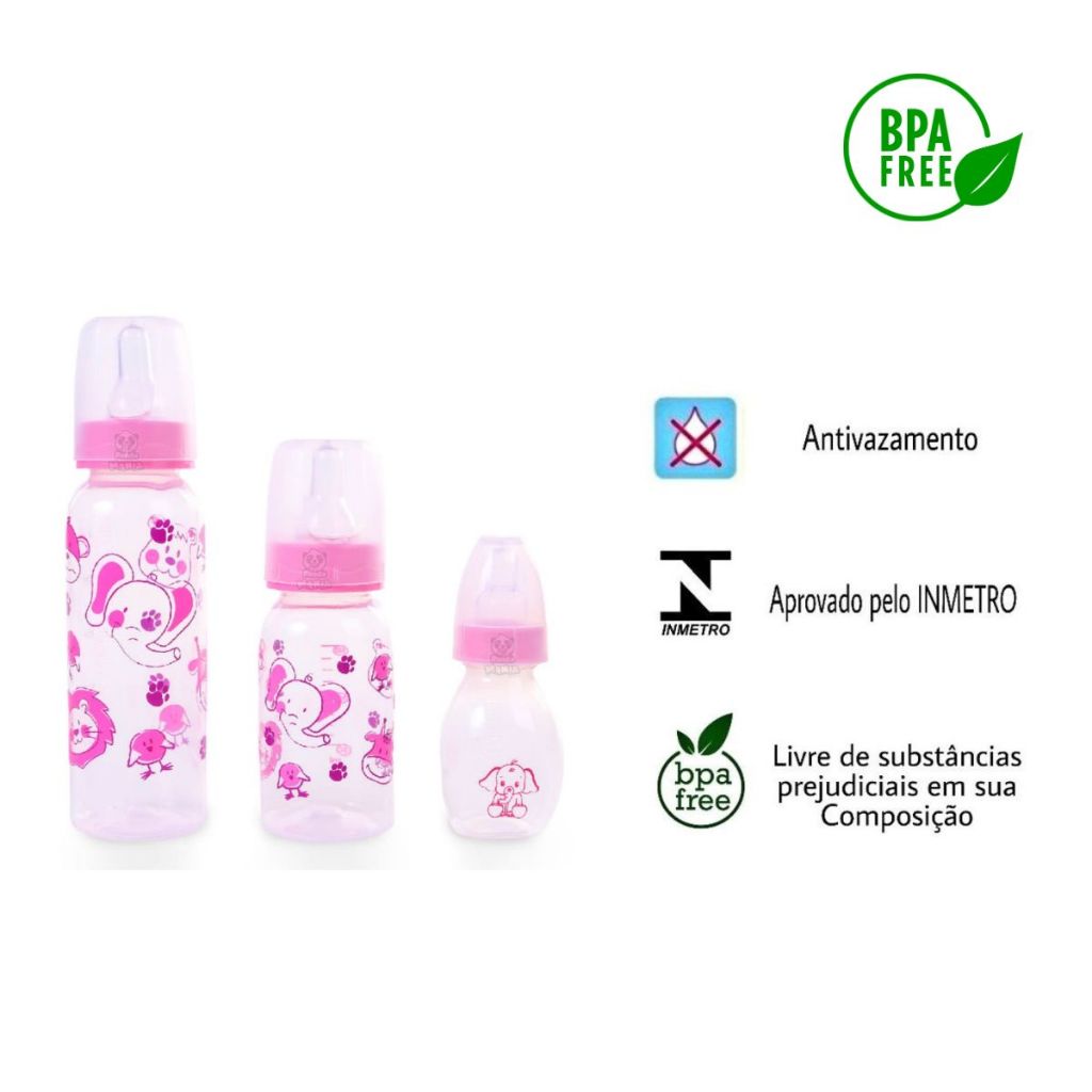 Enviamos no mesmo dia. Kit Contém: * 3 Mamadeiras sendo 240ml 140ml 60ml * 2 Escovas para Lavagem As Mamadeiras tem o bico 100% Silicone foi desenvolvida para garantir conforto e praticidade na hora de amamentar e alimentar o bebê. Além de ter um bico de silicone macio e confortável que se adapta à cavidade bucal da criança ela ainda acompanha capuz anti-vazamento. Bico de silicone Fácil de utilizar, limpar e montar. Certificado pelo INMETRO Livre de BPA: não liberam nenhuma substância tóxica no contato com altas temperaturas e podem ir ao freezer, micro-ondas e lava-louças. * Escova de lavar mamadeiras Feita com a ponta em cerdas retorcidas para atingir os cantos mais difíceis Tem uma quantidade ideal de cerdas para uma limpeza mais eficiente Cabo com opção de pendurar facilitando a utilização dos limpadores Seca Rapidamente Tamanho grande para a Parte interna da Mamadeira e tamanho pequeno para limpar os bicos Envio Imediato!