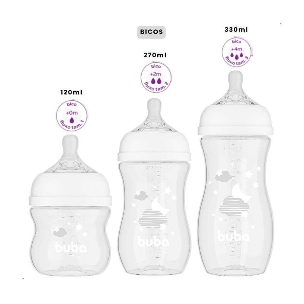 Kit 3 Mamadeiras Buba Easy Flow Anticólica Nuvem 120ml / 270ml / 330ml A Mamadeira Easy Flow Anticólica da Buba conta com um sistema de duas válvulas que evitam a formação de gases e cólicas causadas pela ingestão de ar. Possui bico em silicone ultrasoft, super macio e com textura sedosa, que se assemelha ao bico do seio da mãe. E para acompanhar o crescimento do bebê, os bicos estão disponíveis em 4 fluxos diferentes. Características: - 120ml (+0 meses), 270ml (+2 meses) e 330ml (+4 meses); - sistema anticólica que evita gases: Com duas válvulas que reduzem a ingestão de ar, evitando a formação de gases e prevenindo as cólicas. - bico ultrasoft: Produzido em silicone super macio e com textura sedosa; - designe ergonômico: Confortável de segurar e ideal para as mãozinhas pequenas do bebê; - vedação segura: Evita vazamentos, mesmo que seja virada de cabeça para baixo. - clinicamente testado; - super higiênica: Com bocal largo e cantos arredondados que facilitam a higienização. Vai à lava louças e ao micro-ondas, e pode ser esterilizada. - BPA free; - 0% bisfenol-A;