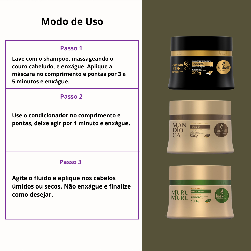 O Kit Máscaras Haskell 300g reúne três tratamentos essenciais para um cronograma capilar completo: reconstrução, nutrição e hidratação. A combinação das linhas Cavalo Forte, Murumuru e Mandioca entrega força, brilho, maciez e resistência para todos os tipos de cabelo, especialmente fios danificados, ressecados ou enfraquecidos. Ideal para quem deseja tratar profundamente os cabelos em casa, alternando as etapas do cronograma de forma prática e eficaz. Benefícios do Kit: Reconstrução da fibra capilar Nutrição intensa e reposição lipídica Hidratação profunda e duradoura Mais brilho, maciez e resistência Fórmulas veganas Sem parabenos e sem corantes O que vem no Kit: Máscara Cavalo Forte 300g – Reconstrução Fortalece e reconstrói fios fragilizados. Rica em biotina, pantenol e proteínas vegetais, ajuda a reduzir a quebra e estimular o crescimento saudável. Modo de uso: Após o shampoo, aplique do comprimento às pontas, deixe agir de 3 a 5 minutos e enxágue. Máscara Murumuru 300g – Nutrição Nutrição profunda para cabelos secos e sem vida. A manteiga de murumuru repõe lipídios, alinha cutículas e devolve brilho e maciez. Modo de uso: Aplique nos fios úmidos, deixe agir de 3 a 5 minutos e enxágue. Máscara Mandioca 300g – Hidratação Hidrata profundamente, devolvendo balanço, brilho e força aos fios. Ideal para cabelos opacos e ressecados. Modo de uso: Aplique após o shampoo, deixe agir de 3 a 5 minutos e enxágue bem. Como Usar no Cronograma Capilar: Reconstrução (Cavalo Forte): 1x por semana ou conforme necessidade. Nutrição (Murumuru): 1 a 2x por semana. Hidratação (Mandioca): 1 a 2x por semana. Intercale conforme a necessidade dos fios para manter equilíbrio, força e saúde capilar. Resultados Esperados: Cabelos mais fortes e resistentes Redução da quebra Fios nutridos e hidratados Brilho intenso e toque macio Aspecto saudável desde as primeiras aplicações