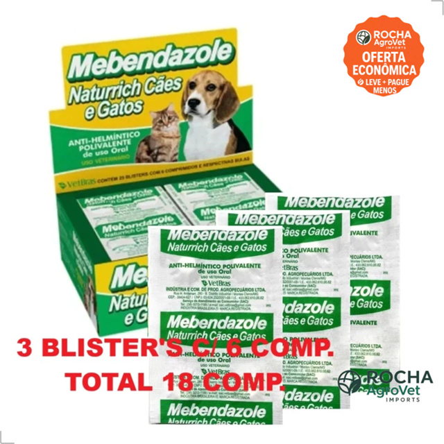 MEBENDAZOLE NATURRICH CÃES E GATOS – O FIM DOS VERMES COM SEGURANÇA VETERINÁRIA Seu pet está sofrendo com vermes intestinais, diarreia, apatia ou perda de apetite? Com o Mebendazole VetBras, você oferece a ele uma solução completa e segura, aprovada por veterinários e utilizada em todo o Brasil. PROTEÇÃO COMPLETA PARA SEU PET: * Anti-helmíntico polivalente: combate múltiplas espécies de vermes; * Uso oral, fácil administração (com ou sem ração); * Eficaz para cães e gatos de diferentes idades e portes; * Fórmula segura, baixa toxicidade; * Ação rápida e duradoura, com excelente custo-benefício. COMPOSIÇÃO E EMBALAGEM: * Mebendazole em comprimido de uso oral; * Embalagem com 3 blisters (6 comprimidos por blister); * Cada comprimido com dosagem ideal para tratamento recomendado; * Produto de uso veterinário – VetBras. COMO USAR: Mebendazole Naturrich Cães e Gatos deve ser administrado por via oral, diretamente na boca do animal ou misturado ao alimento, a cada 12 horas, durante 03 dias consecutivos. INFESTAÇÃO POR NEMATÓDEOS: CÃES: 1 comprimido para cada 10 kg de peso. GATOS: meio comprimido. INFESTAÇÃO POR CESTÓDEOS (TÊNIAS): CÃES E GATOS: dobrar a dose recomendada para nematódeos PERGUNTAS FREQUENTES: 1. Pode ser usado em filhotes? Sim! Desde que tenham mais de 4 semanas de vida e peso compatível com a dose mínima. Sempre com recomendação veterinária. 2. Serve para giárdia e outros tipos de vermes? Sim! O mebendazole atua contra vermes redondos e achatados, além de ser uma das opções indicadas no tratamento da giardíase. 3. Tem efeitos colaterais? Quando administrado corretamente, é considerado seguro. Em raros casos, pode ocorrer diarreia leve ou vômito. 4. Quantas vezes devo dar? A frequência depende do tipo de verme e do peso do animal. Normalmente, a aplicação é única ou com repetição após 15 dias. 5. Pode ser usado preventivamente? Sim, muitos veterinários indicam vermifugação periódica a cada 3 meses, especialmente para pets com acesso à rua. GARANTA A SAÚDE DO SEU PET COM CONFIANÇA! O Mebendazole Naturrich da VetBras é uma escolha segura, prática e eficaz para proteger quem você ama. Compre agora e tenha tranquilidade com a saúde do seu cão ou gato.