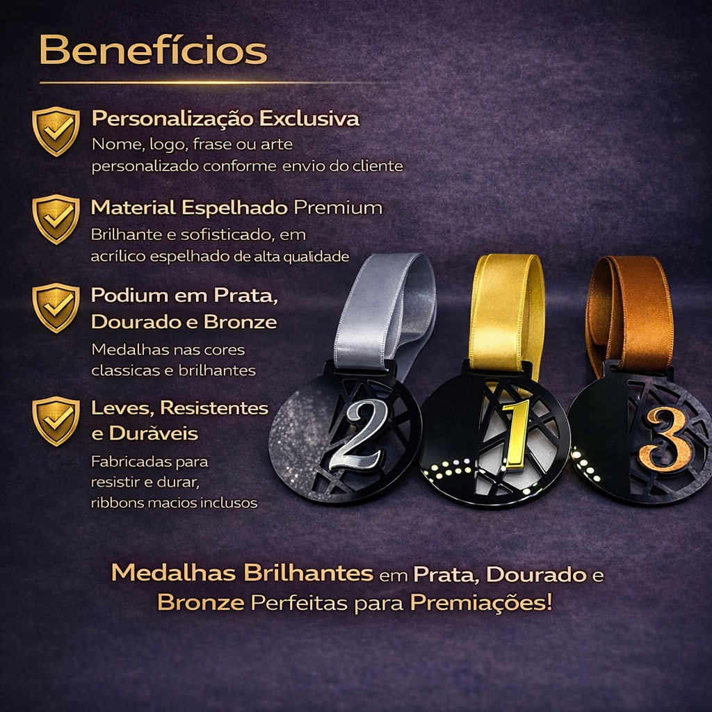 🏅 Kit 3 Medalhas Personalizadas em Acrílico 2mm – Premiações Redonda Lisa O Kit com 3 Medalhas Personalizadas em Acrílico 2mm é ideal para premiações que exigem apresentação elegante, acabamento limpo e personalização sob medida. Com design redondo e liso, permite total destaque para nomes, logotipos, datas ou artes personalizadas, valorizando ainda mais o evento. ✨ Características do Produto Produzidas em acrílico de alta qualidade Espessura de 2mm, garantindo resistência e leveza Formato redondo liso, moderno e versátil Acabamento preciso, com bordas bem definidas Produto durável, não oxida e não desbota 🎯 Indicações de Uso Competições esportivas Eventos escolares e acadêmicos Premiações corporativas Homenagens e reconhecimentos Ações promocionais e comemorativas 📦 Conteúdo do Kit 03 medalhas em acrílico personalizadas (Fitas podem ou não acompanhar, conforme opção do anúncio) ℹ️ Informações Importantes Envie os dados para personalização (nome, logo ou arte) após a compra Ideal para quem busca custo-benefício com aparência profissional Produto leve, resistente e com excelente acabamento