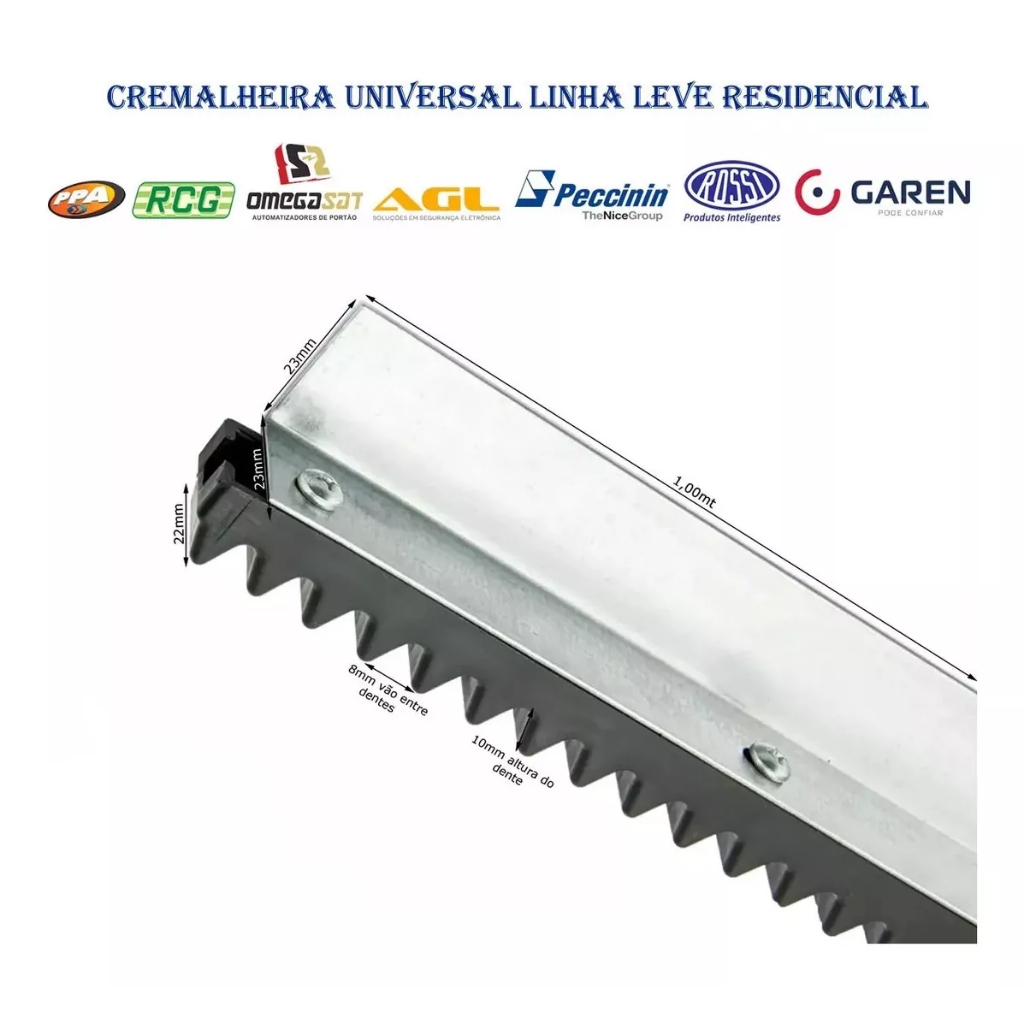 KIT COM 03 METROS ( SEGUEM 03 BARRAS DE 01 METRO ) + 02 IMÃS *** *** Prezado cliente, caso necessite de uma quantidade maior de cremalheiras para compor a largura total do seu portão (acima de 3mts) consulte-nos !!! SEGUE COM NOTA FISCAL Cremalheira Nylon Preto Para Motor de Portão Deslizante Barra de 1m de Comprimento Espessura de 1mm chapa galvanizada Comumente usada nos Motores Residenciais de todas as marcas Cremalheira c/ dentes de nylon preto super resistentes; Base em chapa galvanizada. Pode ser : Parafusada ou Soldada no Portão.