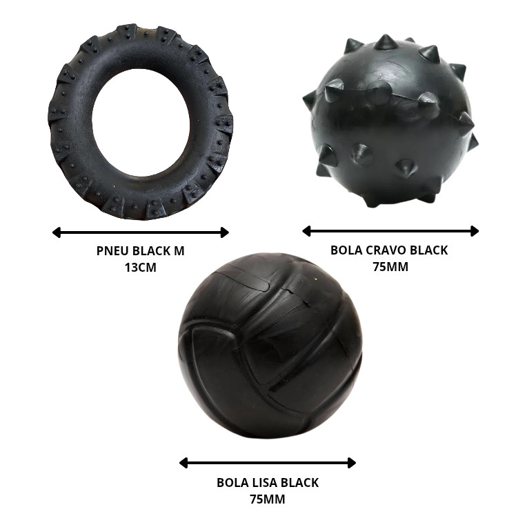 Kit com 3 Brinquedos para Cães Linha Black Tam M - Pneu, Bola Cravo e Bola Lisa Black Garanta diversão, saúde e bem-estar para o seu cão com este kit exclusivo com 3 brinquedos resistentes da Linha Black, ideal para cães de médio porte! **Itens Inclusos no Kit: 1x Pneu Black M – 13 cm de diâmetro 1x Bola Cravo Black – 75MM 1x Bola Lisa Black – 75MM --- ** Características Principais: - Alta resistência: Fabricados com material durável, ideal para cães com mordida forte. - Design robusto: Estrutura reforçada e acabamento em preto fosco, moderno e estiloso. -Textura estimulante: Superfícies com cravos e relevos que massageiam as gengivas. - Tamanho Médio: Ideal para raças médias como Poodle, Beagle, Bulldog, Cocker Spaniel, entre outros. -Atóxicos e seguros: Produzidos com materiais não prejudiciais à saúde do pet. --- ** Indicações de Uso: - Cães de médio porte - Cães com mordida ativa ou que gostam de destruir brinquedos comuns - Cães que passam muito tempo sozinhos e precisam de distração - Cães em fase de dentição ou que gostam de roer objetos --- ** Benefícios para o seu pet: - Reduz o estresse e a ansiedade - Combate o tédio e previne comportamentos destrutivos - Estimula a mastigação saudável - Promove a saúde bucal, auxiliando na limpeza dos dentes - Fortalece os músculos da mandíbula --- ** Modo de Uso: - Ofereça os brinquedos ao seu cão em momentos de brincadeira, como recompensa ou como forma de distração. - Pode ser utilizado com petiscos escondidos (no pneu, por exemplo) para maior estímulo mental. - Supervisionar o uso, principalmente nas primeiras interações, para garantir o uso adequado. --- ** Observações Importantes: - Apesar de resistentes, nenhum brinquedo é indestrutível. - Substitua o brinquedo ao primeiro sinal de desgaste excessivo. - Produto pode variar levemente de tonalidade de acordo com o lote.