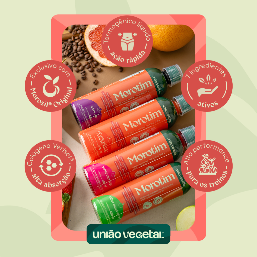 Bem-vinda à Loja Oficial da União Vegetal na Shopee Aqui você encontra suplementos naturais desenvolvidos com rigor científico e sensibilidade, pensados para cuidar de você por dentro e revelar sua beleza natural. São 28 anos de história, com fórmulas inteligentes, ingredientes confiáveis e a certeza de estar comprando direto da marca que une saúde com autoestima feminina. O que você receberá em casa 3 frascos de Morotim termogênico líquido (450 ml) Disponível em 4 sabores: laranja com frutas vermelhas, maçã verde, morango ou uva Rende 30 porções (15 ml ao dia) Produto pronto para uso diário Principais ingredientes da fórmula Morosil® (extrato de laranja moro): termogênico natural e antioxidante Peptídeos bioativos de colágeno VERISOL®: suporte à elasticidade e firmeza da pele Cafeína: ação termogênica e energética Tartarato de L-carnitina: contribui para metabolismo energético Coenzima Q10: proteção antioxidante Picolinato de cromo: auxílio no metabolismo de nutrientes Sinergia entre os ativos A combinação de Morosil®, colágeno VERISOL® e cafeína potencializa a termogênese, enquanto a L-carnitina e o picolinato de cromo aceleram o metabolismo de gorduras e carboidratos, e a coenzima Q10 oferece ação antioxidante para suporte extra à produção de energia celular. Sugestão de uso Ingerir 1 dosador (15 ml) por dia, ou conforme orientação profissional. Informações nutricionais por porção (15 ml) Antocianinas: 4 mg Carnitina: 250 mg Coenzima Q10: 200 mg Cromo: 35 µg Cafeína: 120 mg Beta-alanina: 300 mg Peptídeos de colágeno: 2,5 g Ingredientes Água purificada, peptídeos bioativos de colágeno hidrolisado (2 kDa VERISOL®), café verde em pó, beta-alanina, tartarato de L-carnitina, coenzima Q10, cafeína, picolinato de cromo, glicosídeos de esteviol, ácido cítrico, goma xantana, benzoato de sódio, sorbato de potássio, EDTA cálcico dissódico, aromatizantes e corantes idênticos aos naturais conforme sabor. NÃO CONTÉM GLÚTEN. Contato com a equipe União Vegetal Ficou com dúvidas? Envie uma mensagem aqui mesmo pela Shopee. Nossa equipe está à disposição para atender você com agilidade, empatia e clareza. Perguntas Frequentes (FAQs) Como Morotim se encaixa na minha rotina diária? Tome 15 ml pela manhã para dar aquele impulso de energia e ativar o metabolismo desde o início do dia. Posso tomar em jejum? Sim, especialmente pela manhã, sempre acompanhado de água para melhor absorção. Há alguma contraindicação para gestantes e lactantes? Gestantes e lactantes devem consultar um profissional de saúde antes de usar qualquer suplemento. Este termogênico contém corantes ou aromatizantes artificiais? Não. Todos os sabores usam apenas aromatizantes e corantes idênticos aos naturais. Como conservar o produto após aberto? Mantenha o frasco bem fechado, em local fresco e protegido da luz, e consume dentro do prazo indicado no rótulo. União Vegetal Natural é unir saúde com beleza. Com o apoio da ciência e o poder da natureza, promovemos bem-estar físico e emocional com segurança, confiança e eficácia.