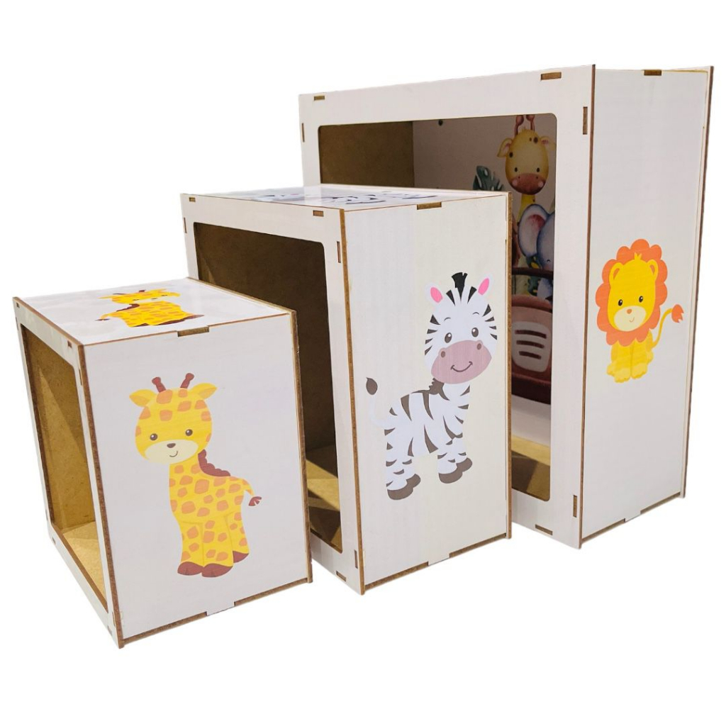 Kit 3 Nicho Quadrado de Parede Quarto do Bebê Montado Safari Bichos