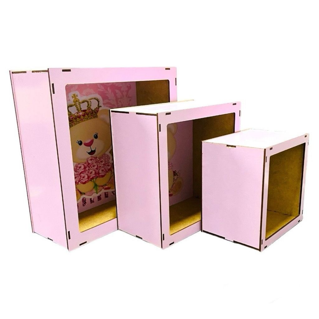 Kit 3 Nicho Quadrado de Parede Quarto do Bebê Montado Urso Princesa Rosa