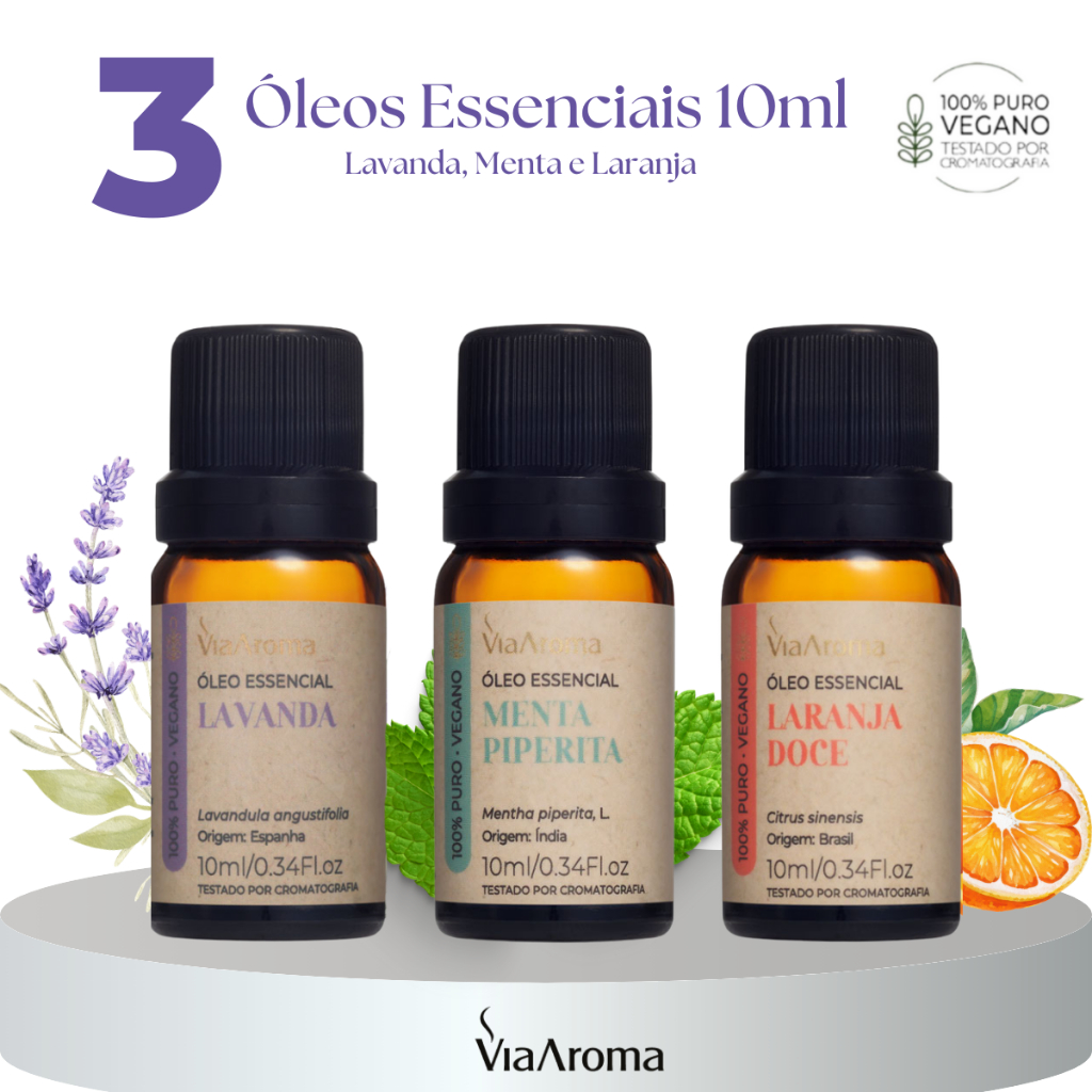 Kit 3 Óleos Essenciais Aromaterapia Via Aroma 10ml – Lavanda, Menta Piperita e Laranja Doce