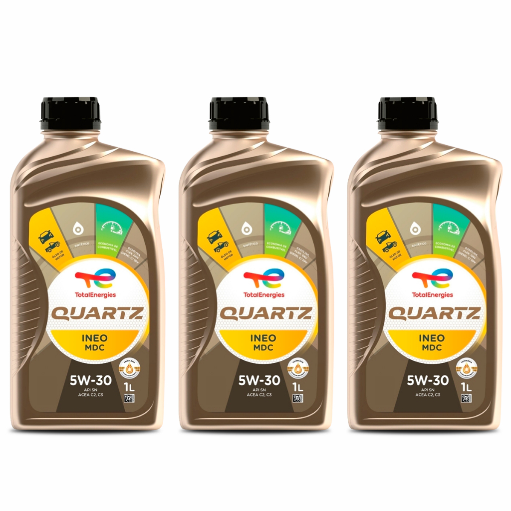Óleo Sintético Quartz Ineo MDC 5W-30 Indicado para motores a gasolina, etanol, flex, GNV e diesel leve com DPF. Normas Internacionais: ACEA C2, C3 | API SN Aprovações de Fabricantes: - MERCEDES-BENZ: MB-Approval 229.52 - GENERAL MOTORS: dexos2™ (Licença: GB2F0312070). Atende os últimos requerimentos de motores GM (Chevrolet, Opel, Vauxhall) - OPEL / VAXHAULL: OV0401547 - HYUNDAI – KIA: atende os requerimentos *Consulte o manual do proprietário do veículo. O novo Ineo MDC 5W-30 óleo sintético de tecnologia avançada Low SAPS. Sua fórmula inovadora está perfeitamente adaptada para atender os mais recentes requisitos para motores Mercedes Benz, GM, Chevrolet e Hyundai – Kia Apropriado para todos os tipos de motores a gasolina, flex e diesel leve (com DPF), inclusive os mais modernos, que requerem cumprir com a normativa EURO VI de controle de poluição. Formulado com tecnologia low SAPS que assegura proteção e funcionamento eficaz dos filtros de partículas e é também adequado para utilização com outros sistemas de pós-tratamento. Também adequado para todas as condições de uso e as mais severas como condução esportiva, rodovia, tráfego urbano pesado e etc. Benefícios: Impacto ambiental reduzido: TOTAL QUARTZ INEO MDC 5W-30 é formulado para proteger sistemas de pós-tratamento e controle de emissões como filtros de partículas, catalizadores e afins, reduzindo assim a emissão de poluentes como HC, NOx, CO e particulados. Longevidade do motor: Este óleo lubrificante garante a longevidade do motor graças as suas propriedades anti-desgaste que protegem as partes mais sensíveis do motor. Proteção e limpeza do motor: graças a sua excelente resistência a grandes variações de temperatura, é garantida uma excepcional proteção do motor e um ótimo nível de desempenho baixo todas as condições de uso. Maiores intervalos entre trocas: TOTAL QUARTZ INEO MDC 5W-30 atende os mais rígidos requisitos das montadoras, permitindo maiores intervalos de trocas. ANP: 21501