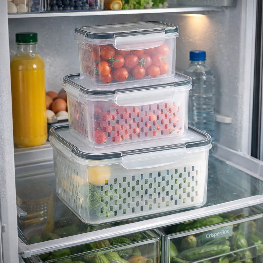 Organizador com 3 Potes Herméticos para Geladeira Ideal para Frutas, Legumes e Alimentos – Com Cestos e Tampas Mantenha sua geladeira sempre organizada e seus alimentos frescos por muito mais tempo! O Organizador com 3 Potes Herméticos é a solução prática e funcional para armazenar frutas, legumes, verduras e outros alimentos com higiene, conservação e economia de espaço. Destaques do Produto: 3 potes herméticos em tamanhos variados, ideais para diferentes tipos de alimentos Capacidades: 1 pote grande: 3.300 ml 1 pote médio: 1.750 ml 1 pote pequeno: 850 ml Cestos internos removíveis, ideais para drenagem de líquidos após a lavagem Tampas com vedação hermética, que evitam a entrada de ar e conservam os alimentos por mais tempo Design transparente e empilhável, otimiza o espaço da geladeira Uso versátil: frutas, legumes, verduras, sobras de alimentos e lanches Material resistente e seguro, plástico PP de alta qualidade, livre de BPA Especificações: Material: Plástico PP (livre de BPA) Quantidade: 3 potes com cestos internos e tampas Capacidades: 3.300 ml | 1.750 ml | 850 ml Fechamento: Hermético Uso: Geladeira (não indicado para micro-ondas) Limpeza: Fácil, com cestos removiveis Conteúdo da Embalagem: 1 Pote Hermético 3.300 ml 1 Pote Hermético 1.750 ml 1 Pote Hermético 850 ml Cestos internos e tampas correspondentes Mais organização, menos desperdício! Ideal para quem busca praticidade, organização e frescor no dia a dia da cozinha. Um item indispensável para manter sua geladeira organizada e funcional!